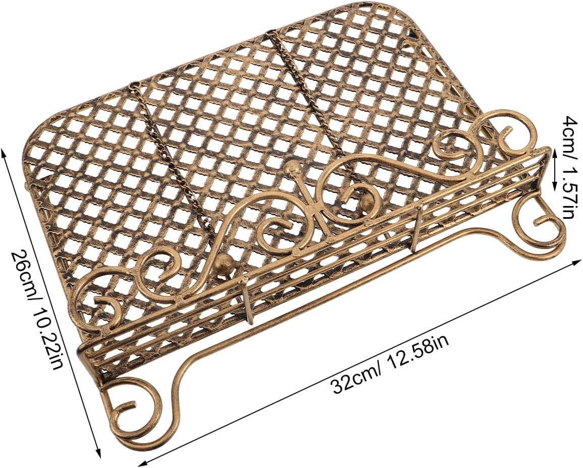 DescriptionEnjoy mess-free cooking with this stylish vintage cook book stand that secures your heavy books or recipe cards while you prepare meals. The cast iron rack stand design blends seamlessly with kitchen or office decor, doubling as a countertop recipe holder, lift reading recipe stand, or recipe book display stand for effortless reference.Features-Color:Golden-Material:iron-Size:32.00X26.00X4.00cm/12.60X10.24X1.57in-Sturdy Metal Frame: This recipe display rack for cooking features iron rack stand that offers reliable support for thick cookbooks or heavy paper holder stand for desk duties every day-Organized Work Area: Enhance your kitchen decor, using this cook book stand, which holds books upright and accessible, serving as a musthave recipe book kitchen decor and organizer-MultiFunctional Stand: Easily switch between recipe book mount, cookbook holder stand, or reading racks by adapting to different tasks in your kitchen, study, or even on countertops-Easy Clean Surface: The iron book holder’s smooth finish assures food splatters and dust can be cleaned off easily, maintaining its elegant look and extending its service life-Modern Vintage Design: Featuring vintage cook book stand details fused with contemporary elegance, this kitchen countertop recipe rack elevates your décor and book display