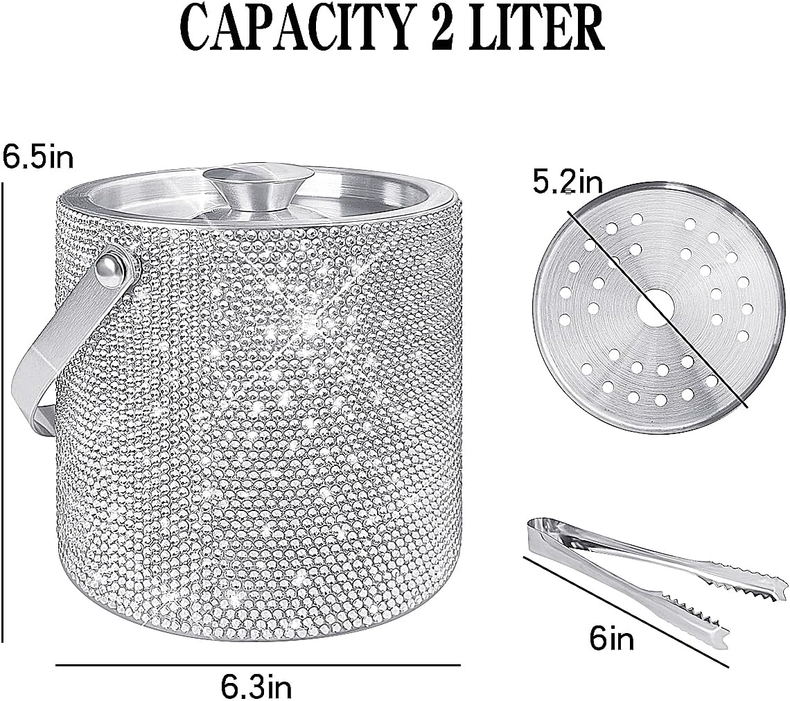 Bling Double Walled Stainless Steel Ice Bucket With Ice Tong & Lid [2 Liter] ,Shiny Insulated Ice Bucket Included Strainer Keeps Ice Cold & Dry, for Home Bar, Chilling Beer, Champagne, Red Wine