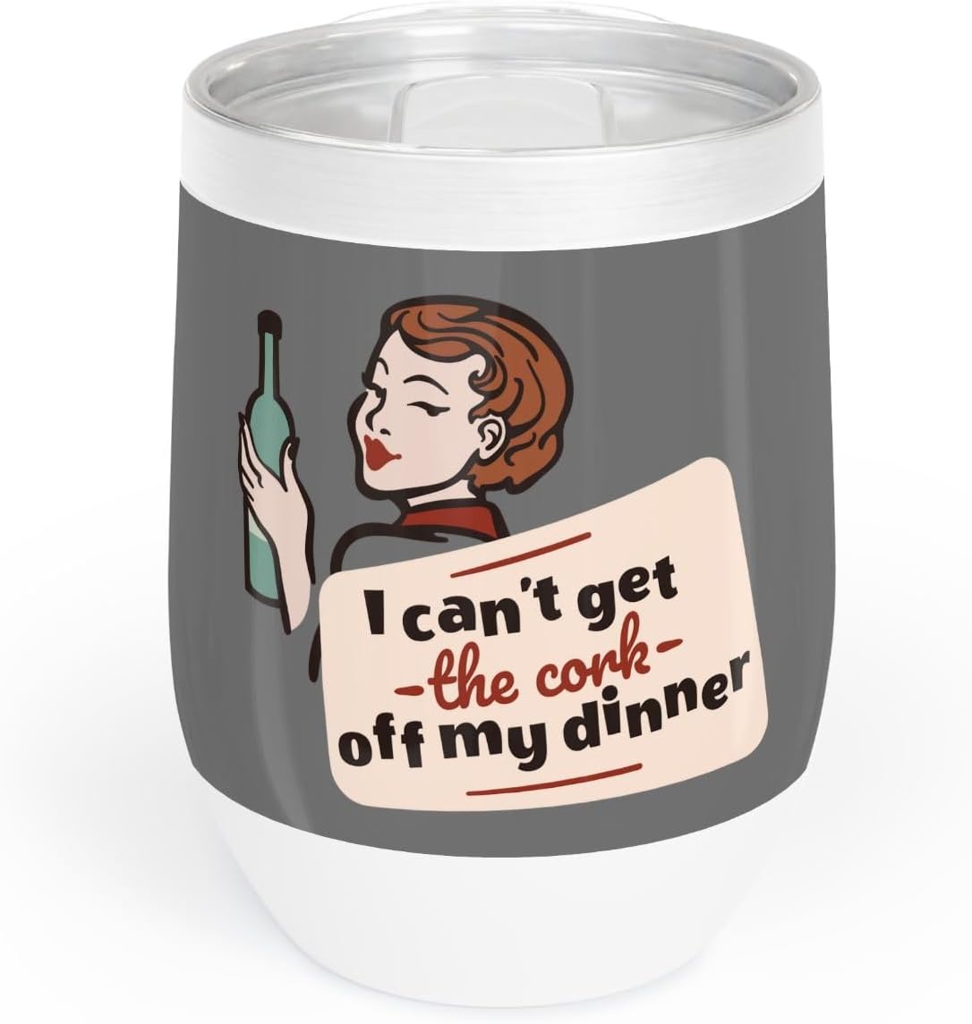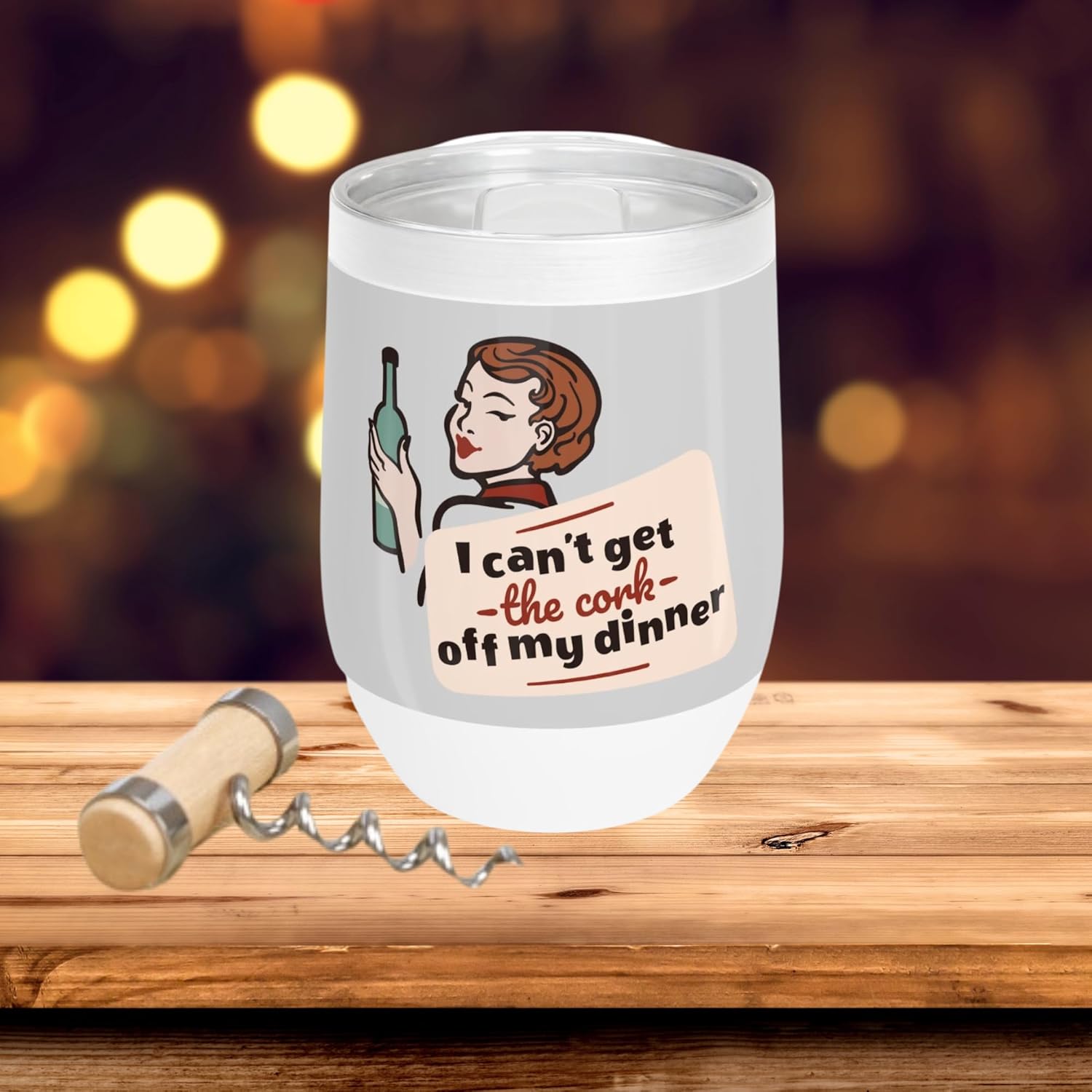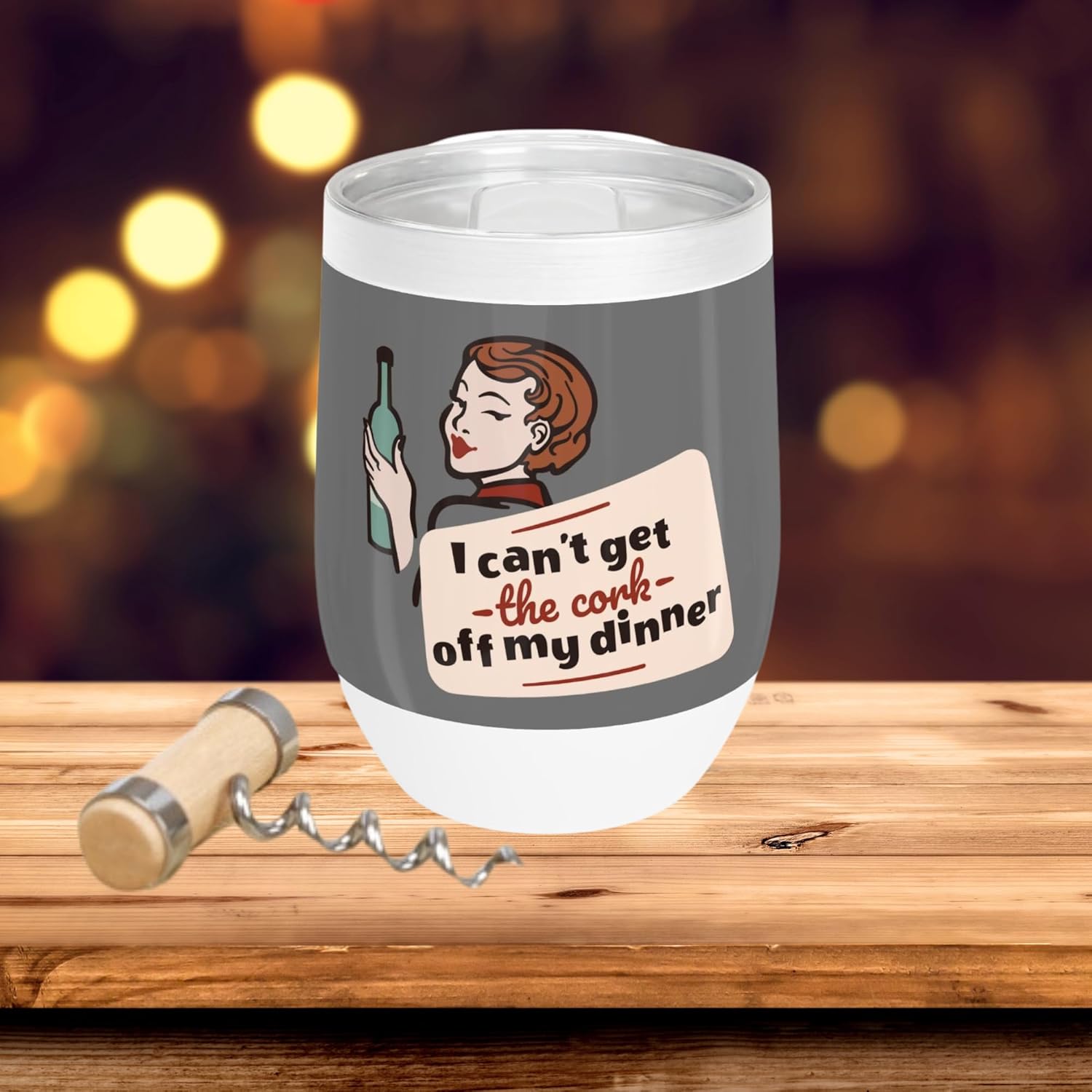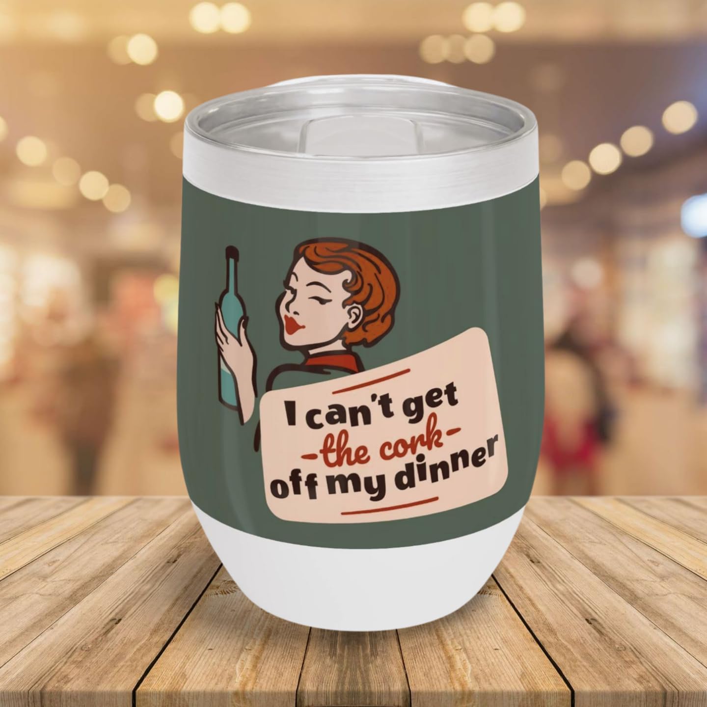 Elevate your wine enjoyment with a touch of humor using our 12 oz. Stainless Steel Insulated Wine Tumbler, featuring the witty phrase: "I Can't Get the Cork Off My Dinner." This tumbler is perfect for those who appreciate a good laugh while savoring their favorite wine. Made from premium stainless steel, this tumbler offers superior durability and insulation. It keeps your wine at the perfect temperature for hours—hot or cold—so you can enjoy every sip exactly how you like it. The double-wall construction ensures your drink stays just right, while the spill-resistant lid adds convenience and prevents spills whether you’re at home or on the go. The sleek 12 oz. design is perfect for a glass of wine, and its modern look fits seamlessly into any setting, from cozy nights in to lively gatherings. This tumbler makes a fantastic gift for wine enthusiasts, adding both style and practicality to their collection. Celebrate your love for wine with a tumbler that’s as fun as it is functional. Order now and toast to good times, great wine, and a touch of humor!