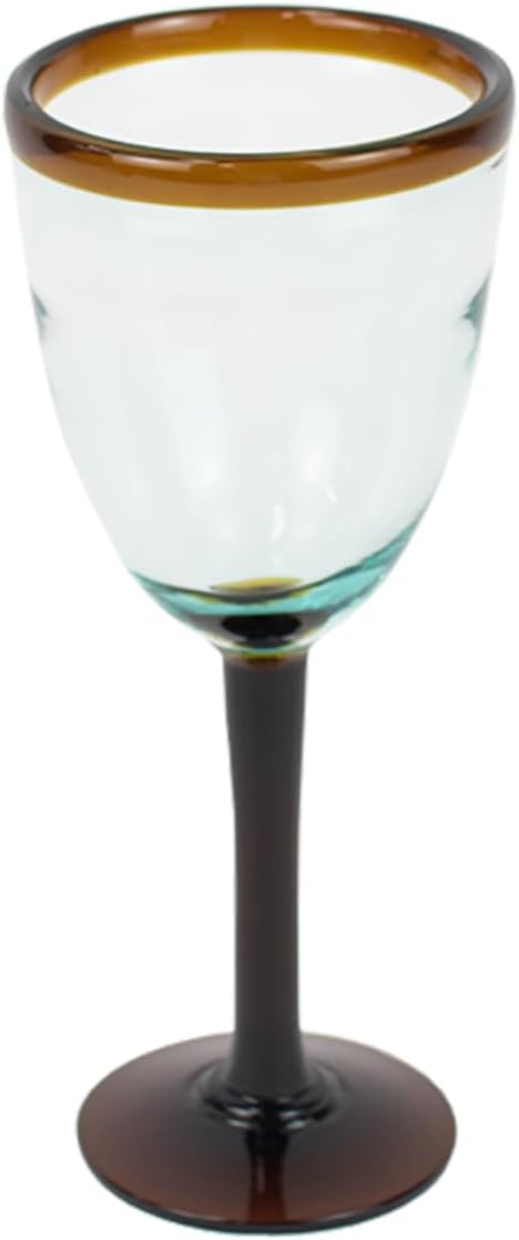 Hand blown by artisans in Colombia, each piece of this recycled glass stemware will hold 8 oz. of your favorite wine. The thick glass and amber accents around the rim and on the stem evoke the artisanal spirit with which it was made. Even the occasional bubble trapped inside the glass makes each one special.