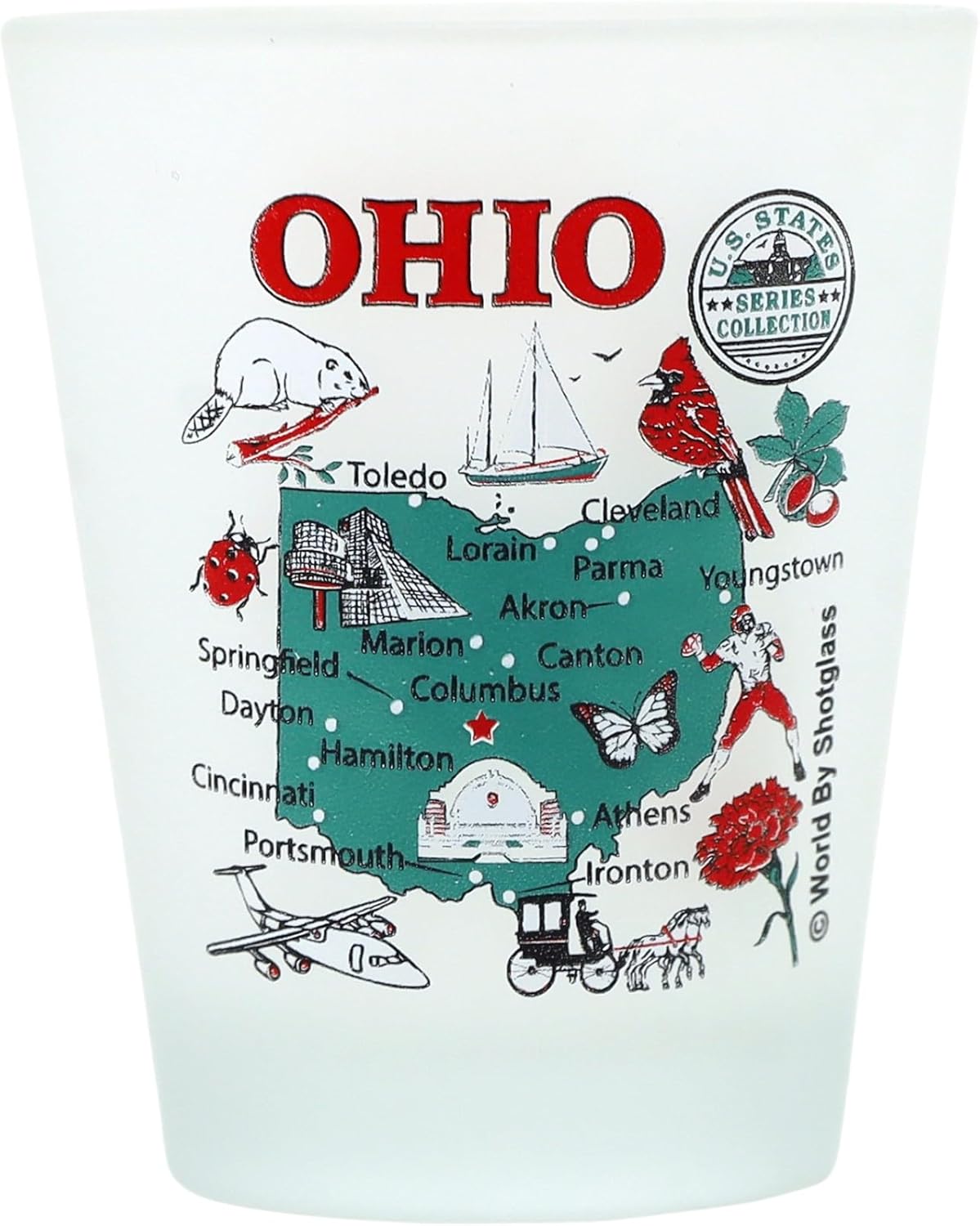 Here is a very rare and hard to find souvenir collectible Ohio United States USA Souvenir Boxed Shot Glass Set (Set of 6). It is a 5x6cm style shot glass boxed set, each glass measuring 2.25 inches tall and 1.8 inches in diameter.