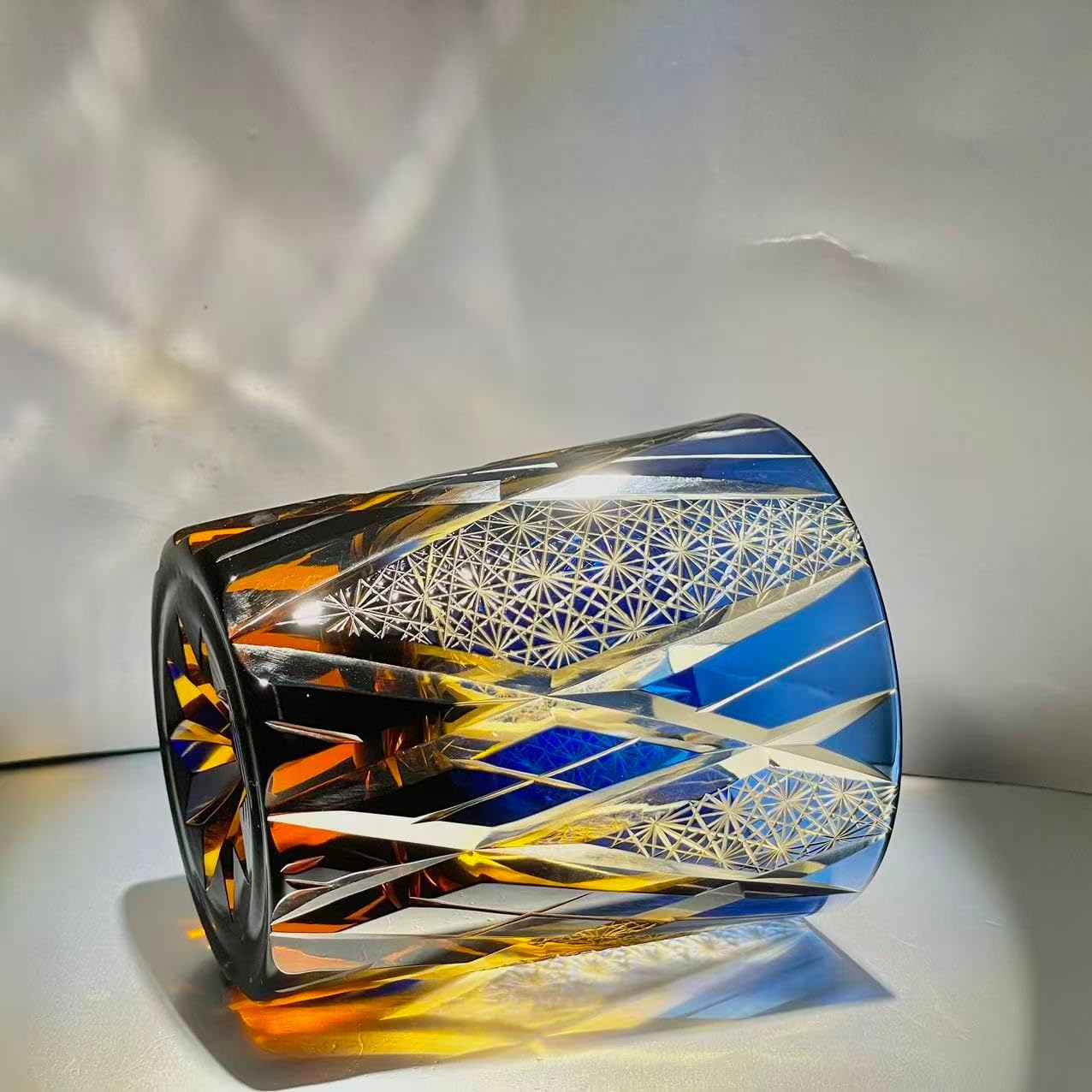 Elevate your drinking experience with this exquisite Edo Kiriko crystal whiskey glass. Each 10-ounce tumbler showcases intricate hand-cut patterns featuring traditional Japanese geometric designs and delicate fan motifs that catch and reflect light beautifully. The amber-tinted crystal glass combines classic craftsmanship with contemporary elegance, making it perfect for serving whiskey, cocktails, or other beverages. The substantial weight and refined finish of this tumbler provide a luxurious feel, while the versatile size makes it suitable for various drinks. The mesmerizing diamond patterns and precise cuts create a stunning interplay of light and shadow, transforming each sip into a visual celebration. These glasses arrive in a luxury gift box, making them an impressive present for whiskey enthusiasts or collectors of fine glassware. The timeless design seamlessly blends with both traditional and modern décor, adding sophistication to any home bar or dining setting. Each glass represents the pinnacle of Japanese glassmaking tradition, promising to make every drinking occasion special.