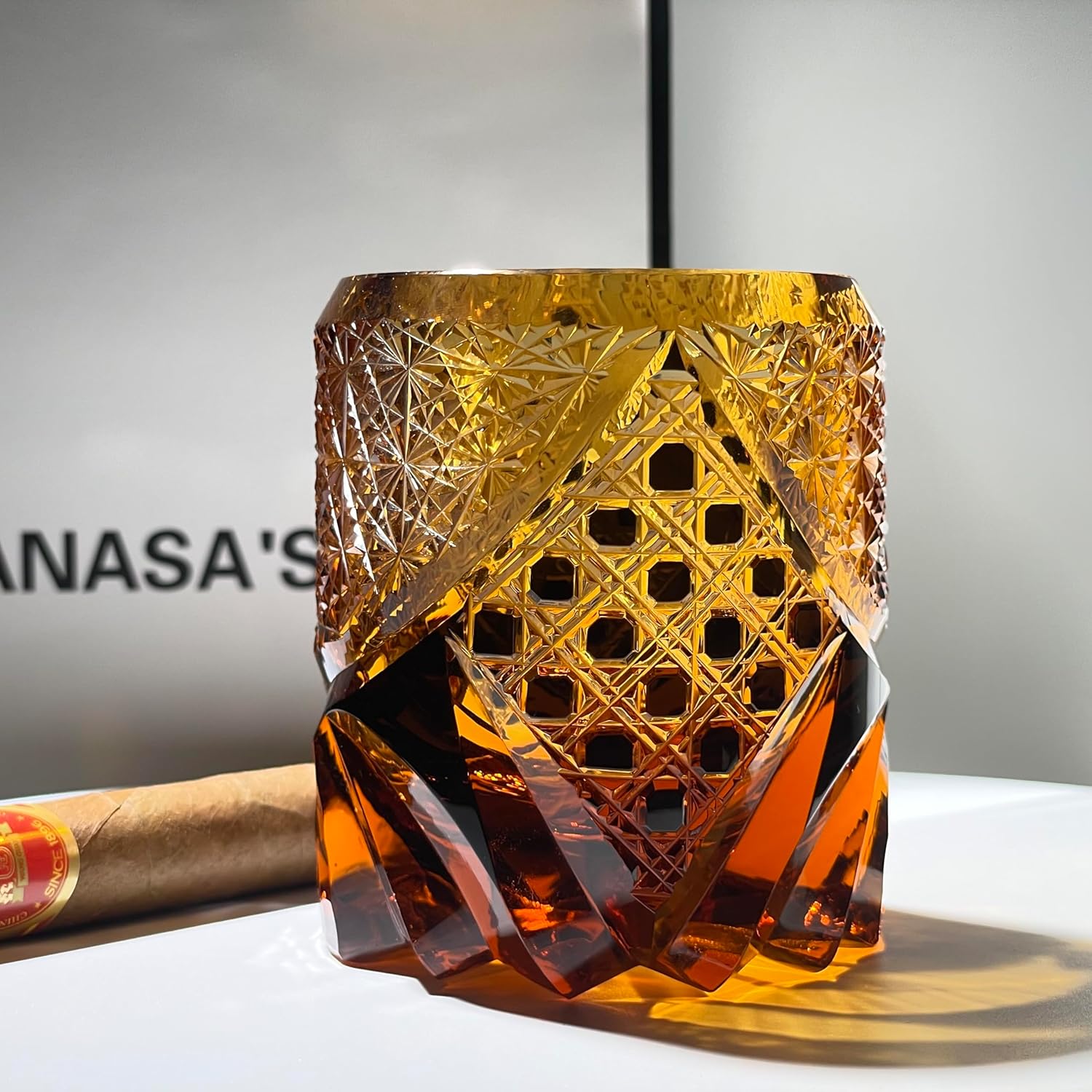 These exquisite Japanese crystal whiskey glasses from Tajima showcase the traditional art of Edo Kiriko, featuring intricate hand-cut patterns that create a stunning visual display. The amber-hued crystal catches and refracts light beautifully, adding warmth and elegance to your drinking experience. Each glass in this set of two displays meticulous craftsmanship with detailed geometric cuts and textured surfaces that provide both aesthetic appeal and a comfortable grip. The vintage-inspired design combines classic Japanese artistry with modern functionality, making these tumblers perfect for serving bourbon, whiskey, cocktails, or your favorite spirits. The substantial weight of the crystal glass speaks to its quality construction, while the timeless amber color adds a sophisticated touch to any home bar or table setting. Whether you're enjoying a quiet evening at home or entertaining guests, these distinctive glasses elevate every sip into a special occasion. The unique combination of traditional Edo Kiriko cutting techniques and contemporary tumbler styling makes this set an ideal gift for whiskey enthusiasts, collectors of fine glassware, or anyone who appreciates authentic Japanese craftsmanship and design.
