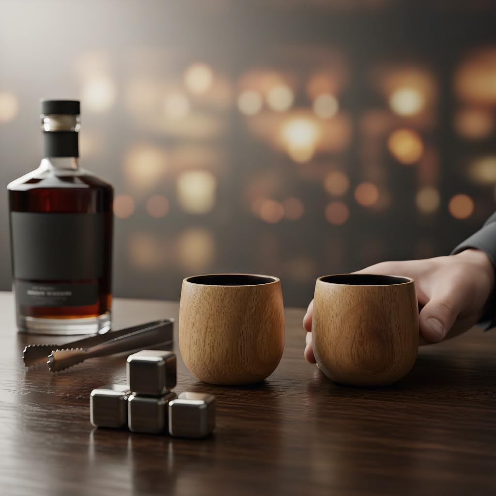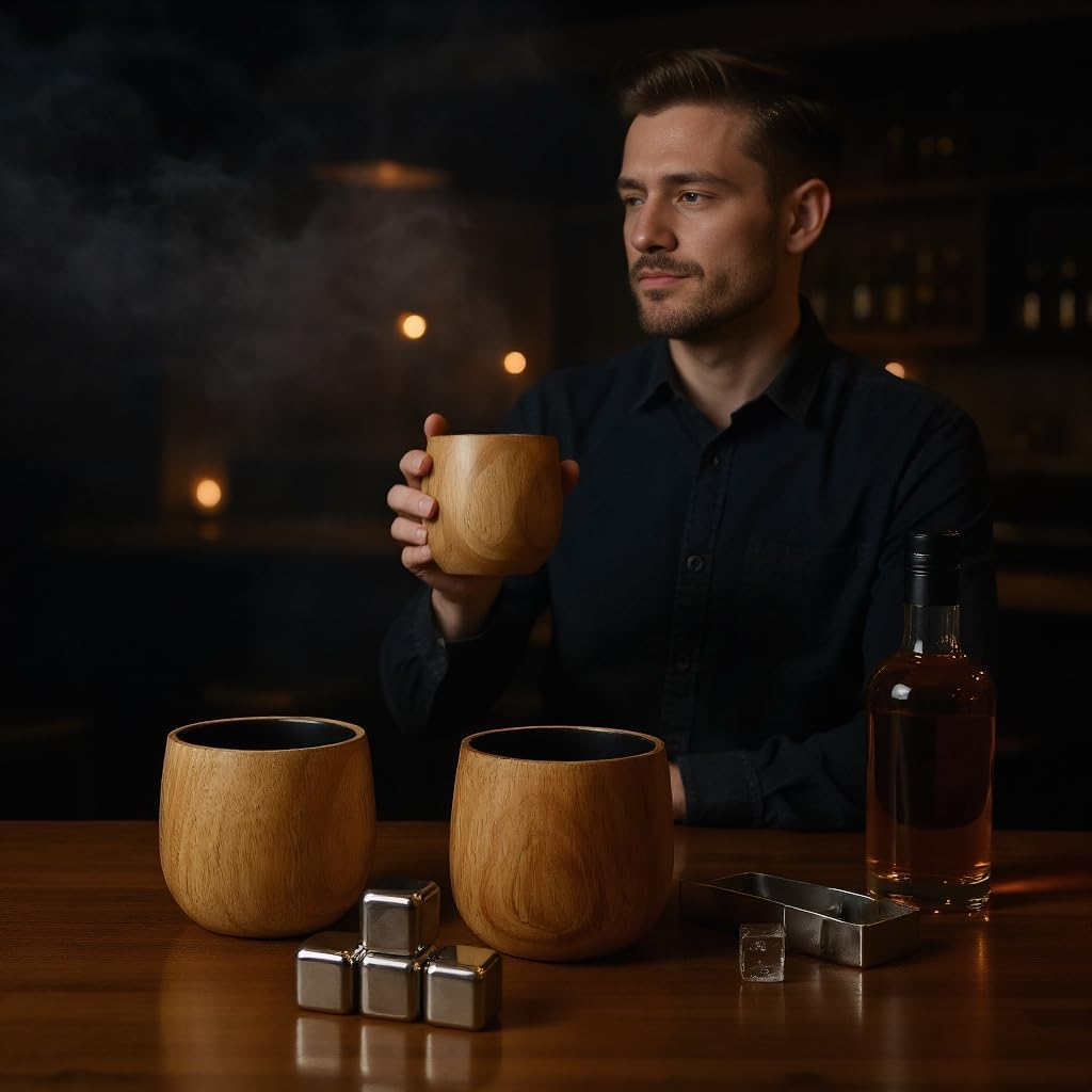 Elevate your whiskey-drinking experience with the HINTING Charred Wooden Bourbon Drinking Glass set. This set of 2 handcrafted wooden whiskey glasses showcases stunning natural wood grain patterns, giving each cup a one-of-a-kind appearance. The rich, warm tones and charred interior finish add a rustic yet sophisticated touch that any bourbon enthusiast will appreciate. Each glass comes with its own wooden coaster, keeping your surfaces protected in style. The set also includes stainless steel ice cubes, so you can chill your drink without diluting its bold flavors. Whether you're treating yourself or searching for the perfect gift for the whiskey lover in your life, this set makes an impressive and thoughtful choice for Father's Day, birthdays, or any special occasion. Hand wash recommended to preserve the natural beauty of the wood.