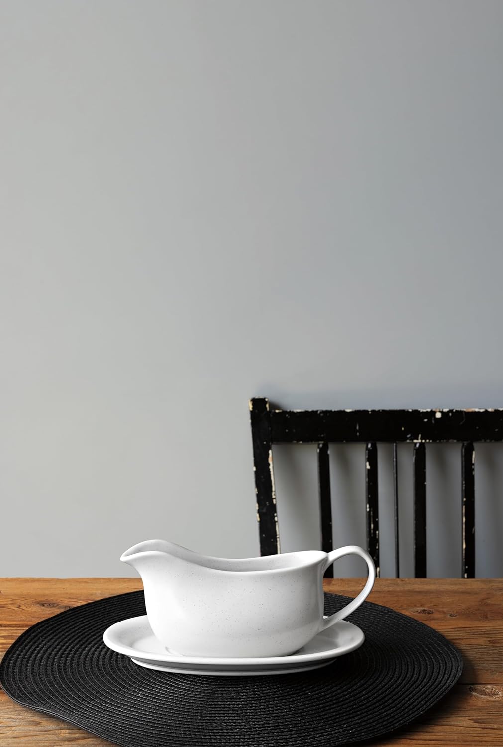 This classic White gravy boat is a must-have for any Thanksgiving or Holiday table. Dimensions: Gravy Boat: W3.25 x L8.25 x H3.25in / Saucer: W5.25 x L8.7in Material: 100% Stoneware Care Instructions: Dishwasher, microwave, and oven safe to 400F. Capacity: 15 oz