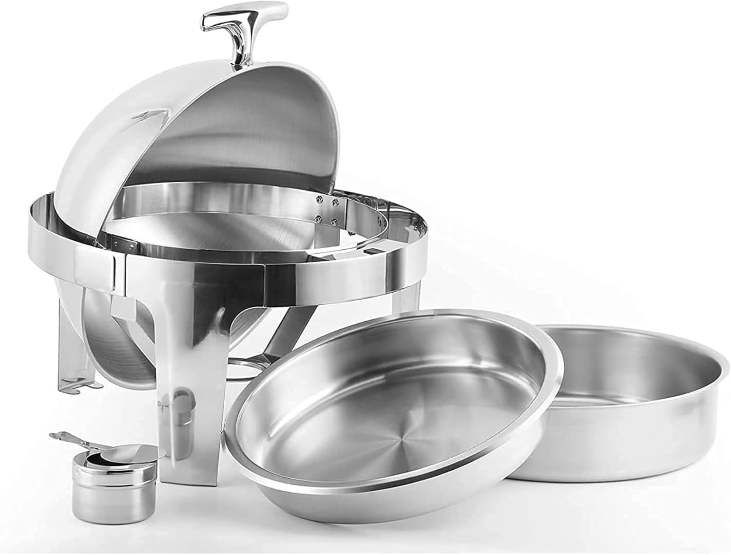 6.8L Round Roll Top Chafing Dish Our round roll top chafer is made of highly-polished stainless steel for the perfect presentation! Features a roll top cover that can be opened fully to 180 degrees,or can stop at 90 degrees,It is beautiful and keep the dish in it warm and inviting.The dome provides plenty of space for a large entree.Distinctive curves and profile create a style that accentuates any presentation from casual to fine dining.Understated elegance complements any buffet setting.It's the best choice for you! Features: Large Serving Capacity Maintain Temperature Elegant Design Convenient Usage Specifications Quantity: 1 sets Material: Stainless Steel Capacity: 6 quarts (6.8 L) Top Cover Angle: 90°/180° Gross Weight: 16.5 lb (7.5 kg) Chafe Dimensions: 43x46cm/16.9x18.1in(H X W) Food Pan:6.6x35.8cm/2.6x14.1in (H X Dia) Water Pan: 10.4x35.8cm/4.1x14.1in (H X Dia) Fuel Holder: 6cm/2.4in H Package Content: 1 x Round Roll Top Chafer Sets