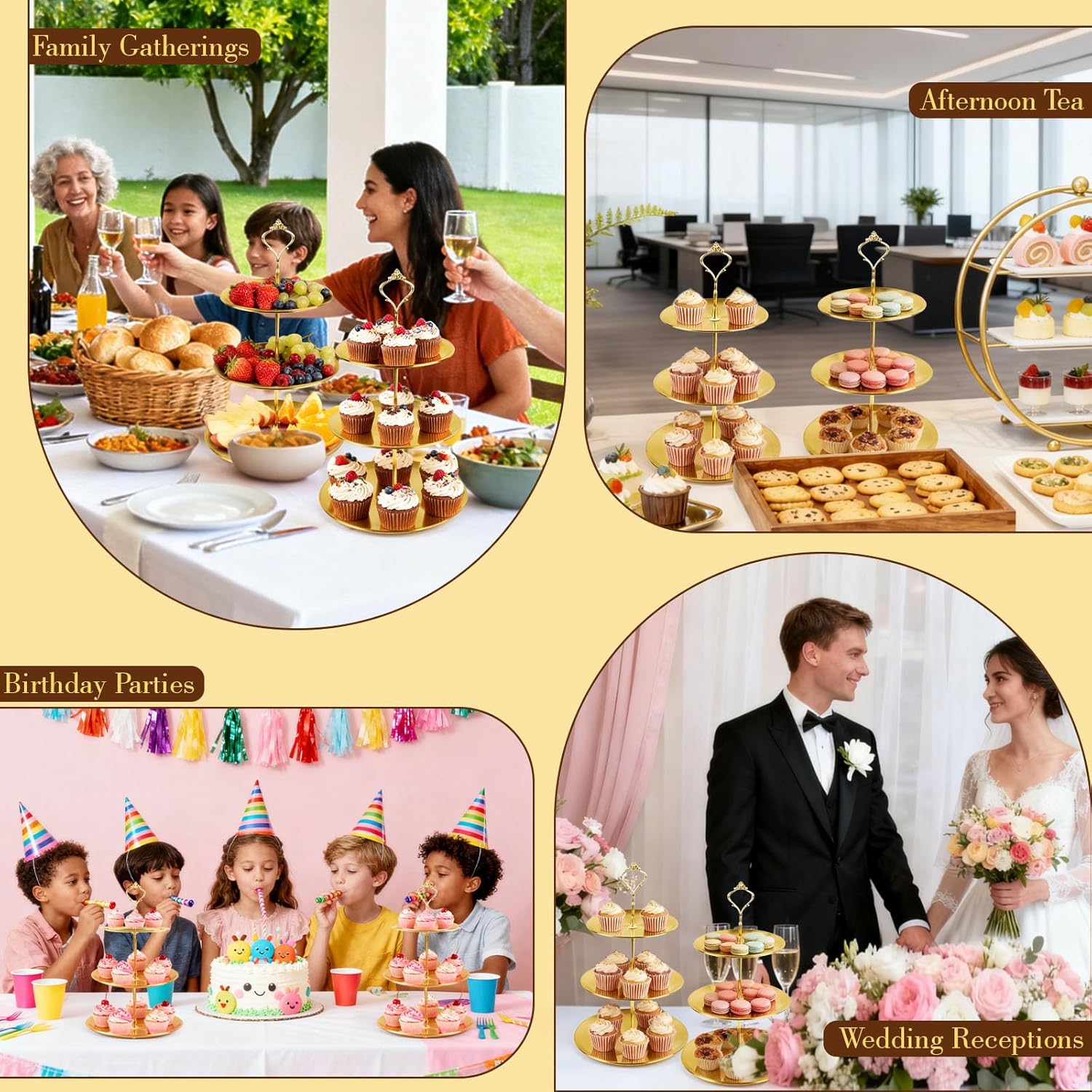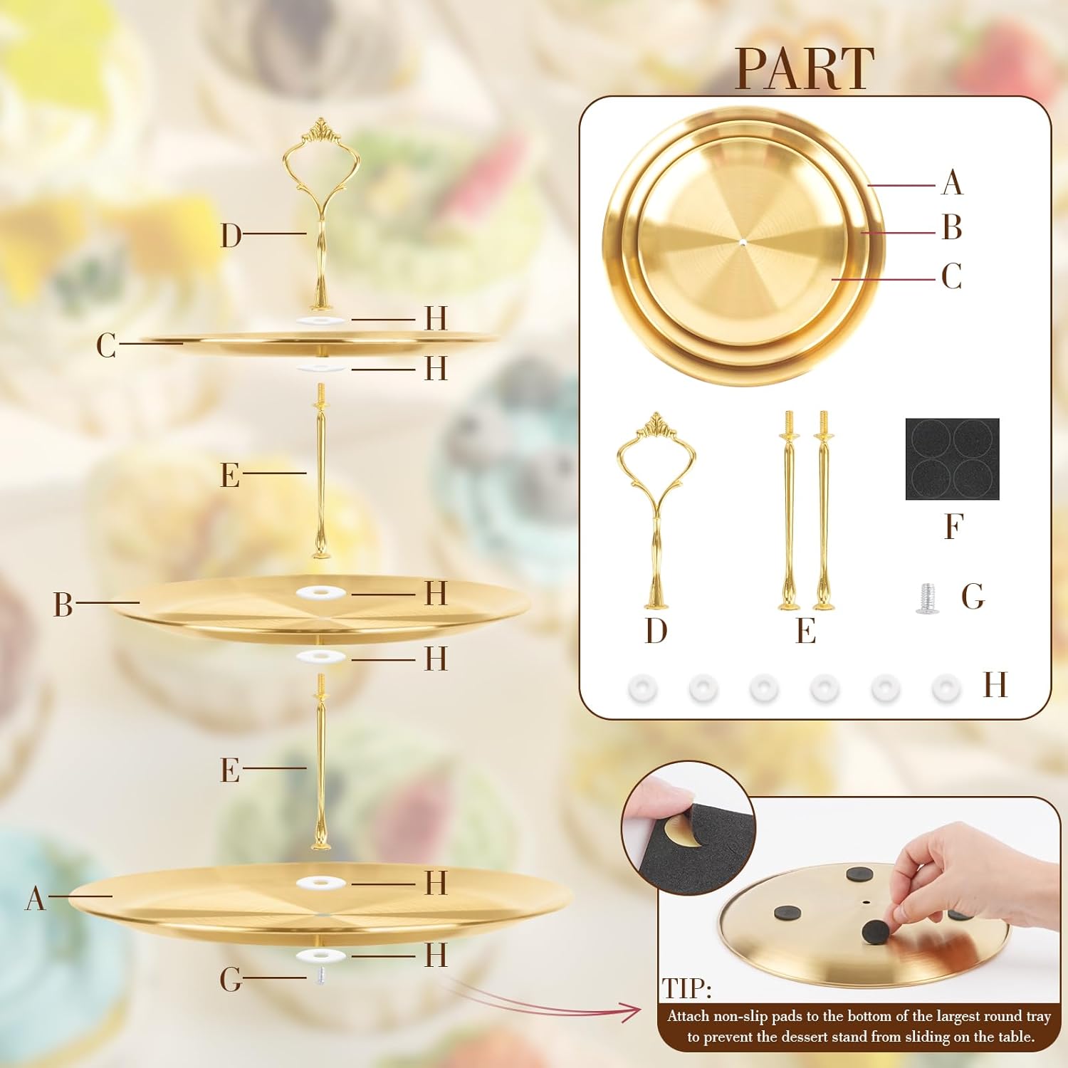 Elevate Your Event with Luxurious Dessert Displays! Leave a lasting impression on your guests with our stunning three-tiered gold cupcake stand — a product that perfectly blends elegance with functionality. Whether you're hosting a wedding, birthday party, or afternoon tea gathering, these stands provide a sophisticated platform to showcase your desserts, while maximizing space and enhancing visual appeal. Luxurious Gold Design: Features an electroplated gold finish paired with exquisite handle details, infusing a refined touch into any setting. Sturdy Construction: Crafted from stainless steel, complemented by non-slip pads for enhanced stability. Spacious Capacity: Each stand can hold up to 18 cupcakes, or a variety of other desserts, snacks, and fruits. Easy to Clean: Simply wipe with a damp cloth or neutral cleaning agent for hassle-free maintenance. Space-Saving: Can be disassembled into a flat form, facilitating compact storage and easy portability. Applicable Scenarios: Weddings and wedding receptions Birthdays and anniversary parties Afternoon tea and brunch gatherings Holiday celebrations (Christmas, Easter, etc.) Café and bakery displays Family gatherings and formal events2-Piece Set for Great Value: Double Practical Value, Suitable for Large-Scale Events or Multi-Table Display Needs Versatile Uses: Can display cupcakes, pastries, macarons, fruits, and even pre-meal snacks.Time-Saving Assembly: No tools required, and assembly can be completed in just a few seconds!Both Elegant and Practical: Enhances the display effect while keeping desserts neatly arranged and easily accessible. Package Includes: 2 three-tiered gold cupcake stands 8 non-slip pads (4 pads per stand) No additional tools needed Make your dessert table the highlight of the event! Choose this luxurious yet practical stand to turn your next event into an unforgettable experience.