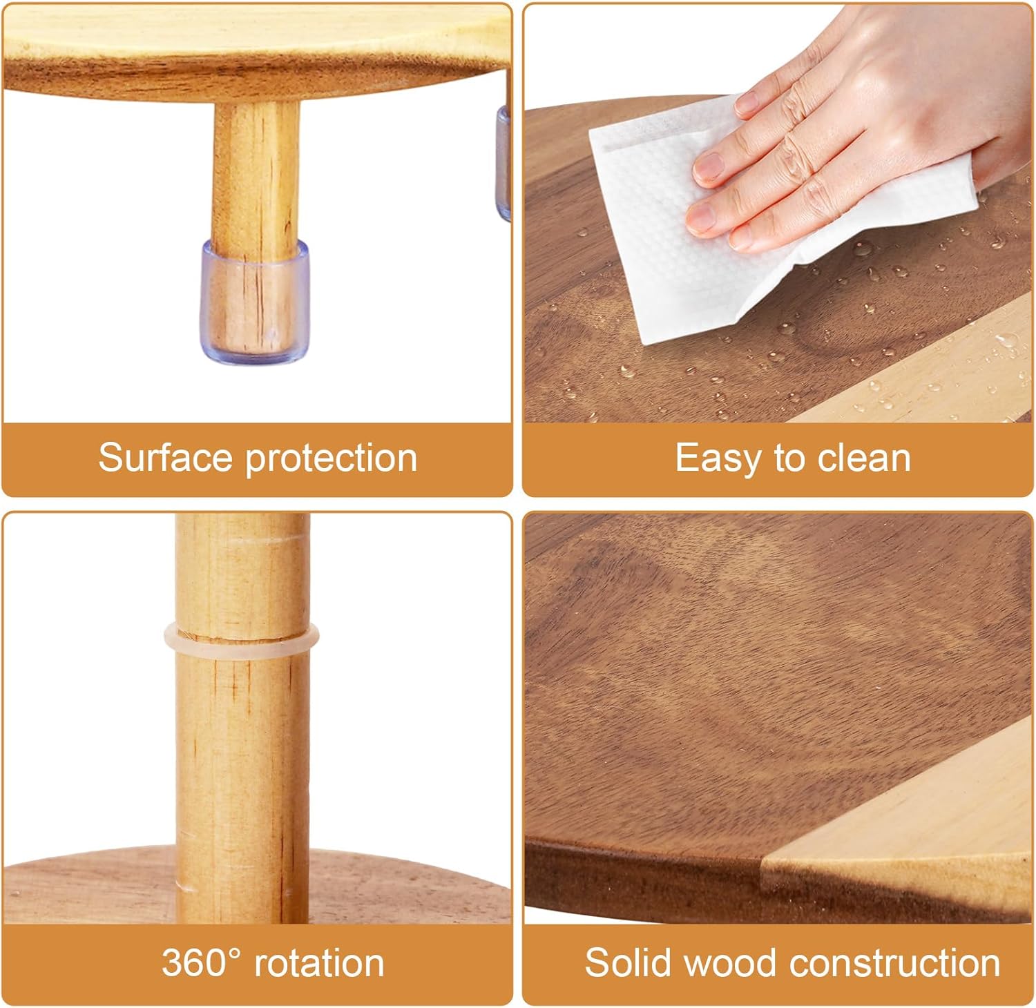 Material: Acacia wood Color: Natural wood Features: Designed with a 360° rotating function, allowing easy access to cakes and cupcakes from any angle for convenient serving. The round three-tier structure makes efficient use of vertical space, creating a layered dessert display while keeping the tabletop neat and organized. Usage Scenarios: Suitable for dessert tables at birthday parties, weddings, baby showers, holiday celebrations, and family gatherings. In addition to displaying cakes and desserts, it can also be used to showcase pastries, fruit, or decorative items, making it a versatile tabletop display stand for various occasions.