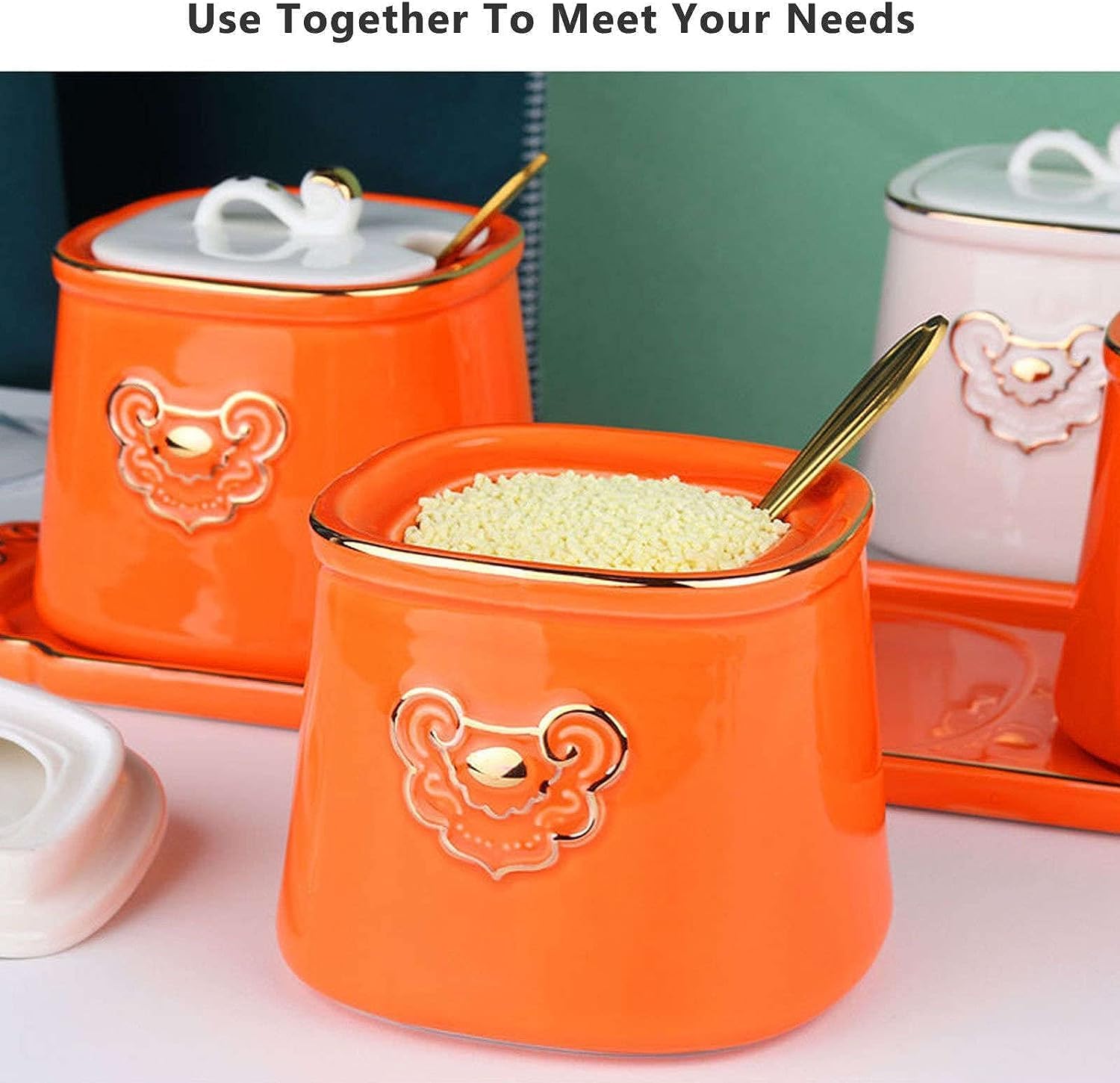 MAKE DINING MORE ENJOY!! Product name: Seasoning Jar Set / Seasoning Box Set /Condiment Container Set / Spice Container Set Material: Ceramic Product style: with lid + spoon + tray Product Package Contents: 1* Seasoning Box Set Functional: Simple design,spices container set easy to clean,can be used to store sugar cubes,creamer,salt,pepper,etc. Multi-scene application: It is suitable for all kinds of scenes - family, hotel, cafe, party, restaurant with the elegant white porcelain and simple design. It is also suitable as a housewarming gift for your friends.