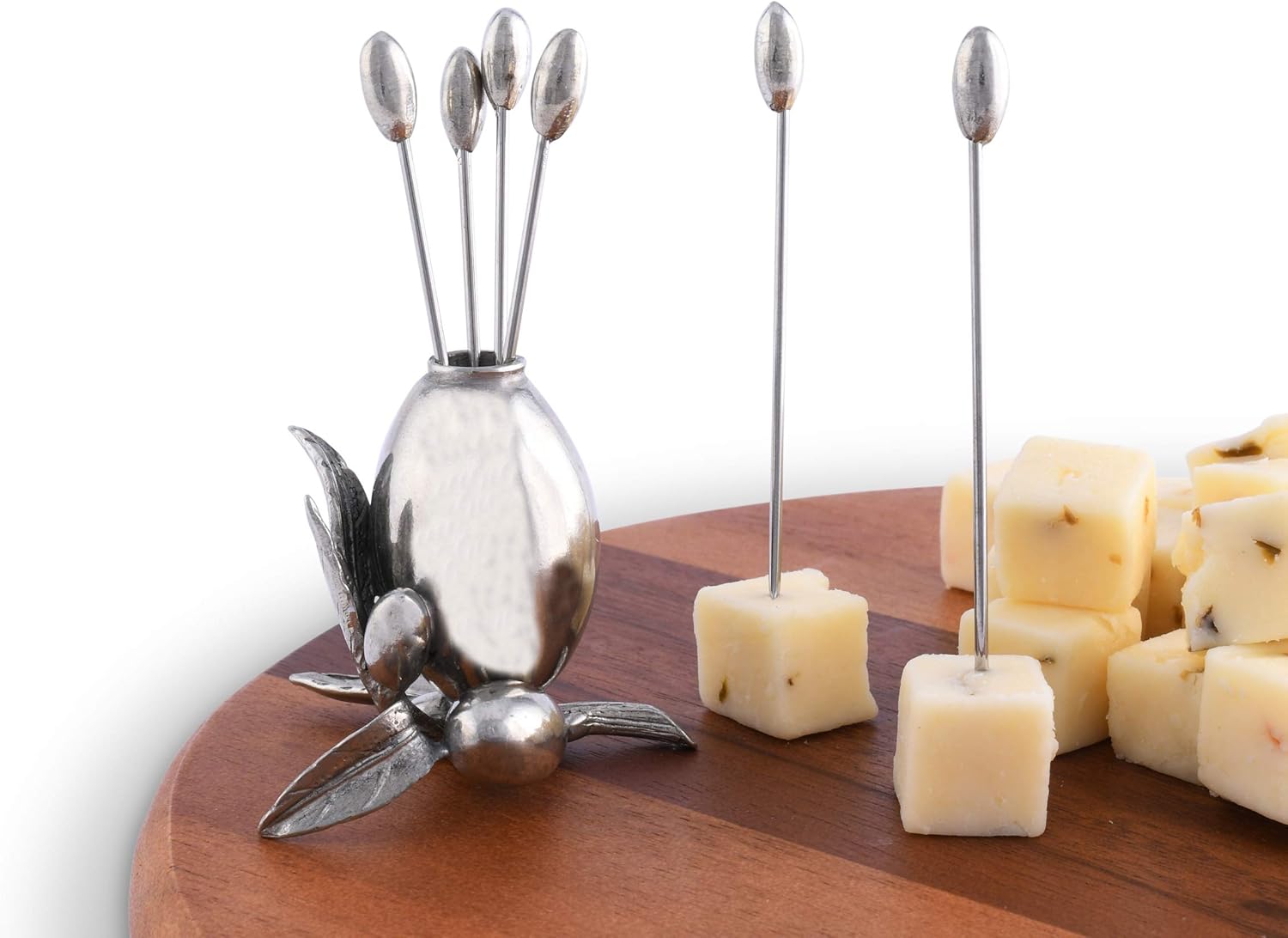 Bring a bit of Mediterranean art and joie de vivre to your cheese service with our Olive Cheese Pick Set. Hand-cast in luxury pewter as a miniature still life of a fruit laden Olive twig, the holder has six picks, each topped with a tiny pewter olive.