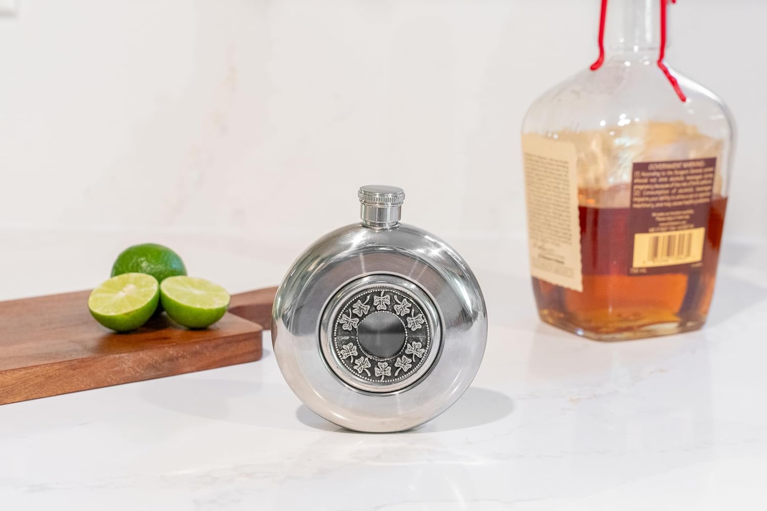 This round hip flask is made of durable stainless steel. Its sturdy and has a simple-to-use screw down cap. The smooth steel surface is perfect for engraving and the flask holds 5oz of liquid. There is a open face clear area to the front around an embossed design.