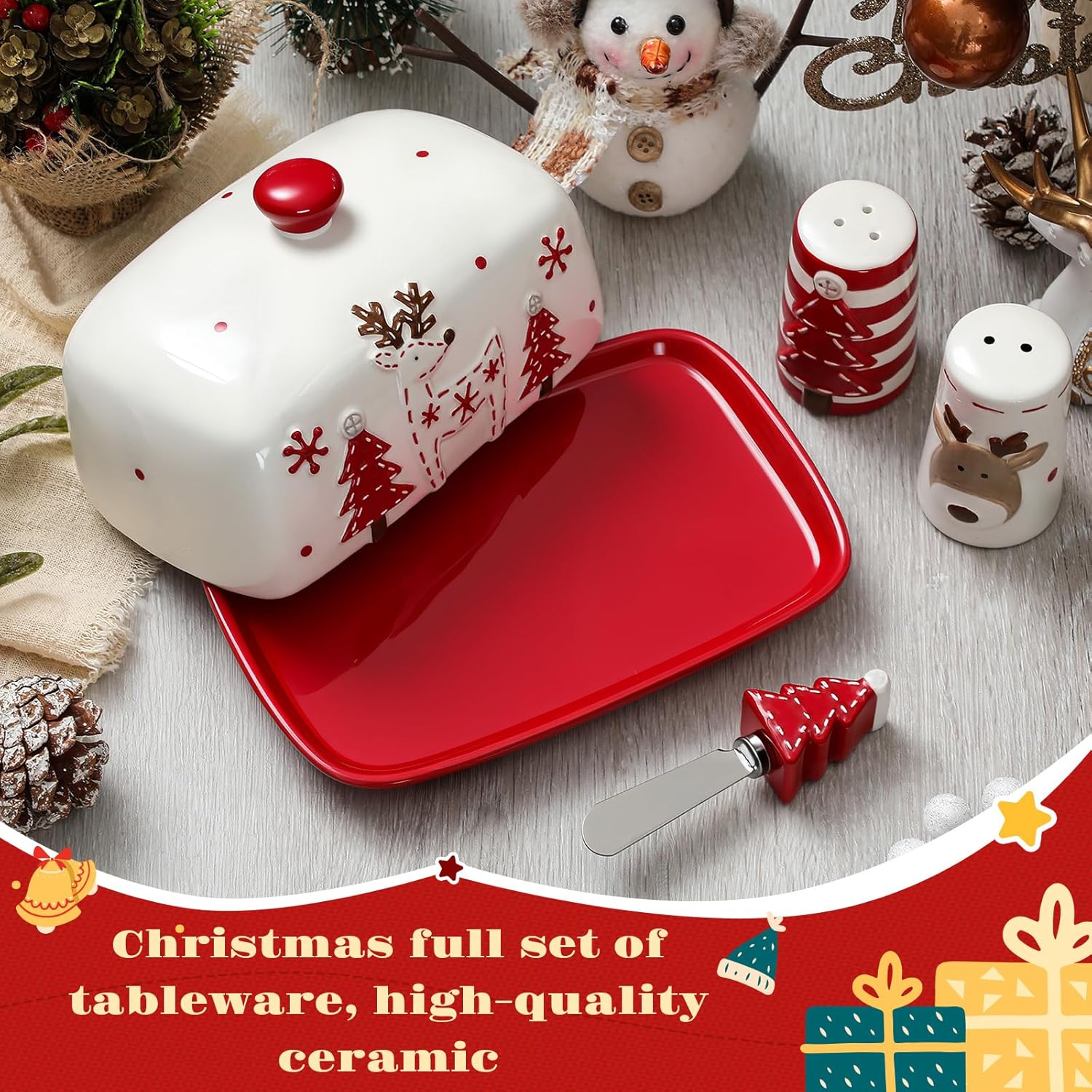Features: Thoughtful Holiday Gift: A wonderful present for loved ones who adore stylish Christmas decoration. Durable enough to be cherished year after year, making it a heartfelt seasonal gift. Practical & Decorative: The lidded butter dish preserves freshness, the shakers ensure easy seasoning, and the stainless steel-bladed spreader offers smooth use–blending functionality with Christmas charm. Specifications: Material: ceramic Color: red, white and brown Size: Butter dish: approx. 7.48 x 4.92 x 4.06 inches/ 19 x 12.5 x 10.31 cm Salt and pepper shakers: approx. 2.95 x 1.77 x 1.77 inches/ 7.49 x 4.5 x 4.5 cm with a 0.59 inch/ 1.5 cm diameter opening Butter knife: approx. 4.33 inches/ 11 cm Package includes: 1 × Butter dish 2 × Salt and pepper shakers 1 × Butter knife Notes: Manual measurement, please allow slight errors on size. The color may exist a slight difference due to different screen displays