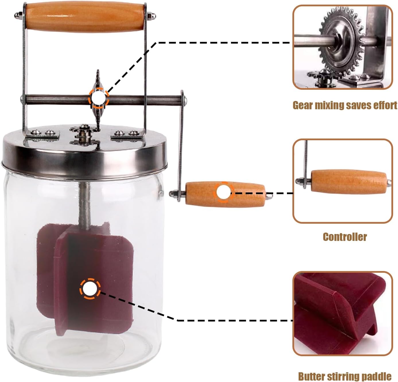 Description: The butter churner is a versatile and user-friendly tool that allows you to make your own butter at home. With its simple design, large capacity, materials, ergonomic features, and wide mouth, it's the perfect choice for anyone who wants to experience the joy of homemade butter. Whether you're a seasoned cook or a beginner, this churner is easy to use and produces results every time. Plus, its environmentally friendly materials and easy-to-clean design make it a great choice for those who want to reduce their on the planet. So why not try making your own butter at home with the help of this fantastic tool? Features:. Butter Churner. -Color: Silver, Wood Color. -Material: Glass, Wood. -Size: about 24.2x10.5x10.5cm/9.53x4.13x4.13inch. Note: Manual measurement, please allow slight errors on size. The colors may exist slight difference due to different screens. Package Including 1 Piece Butter Churner.