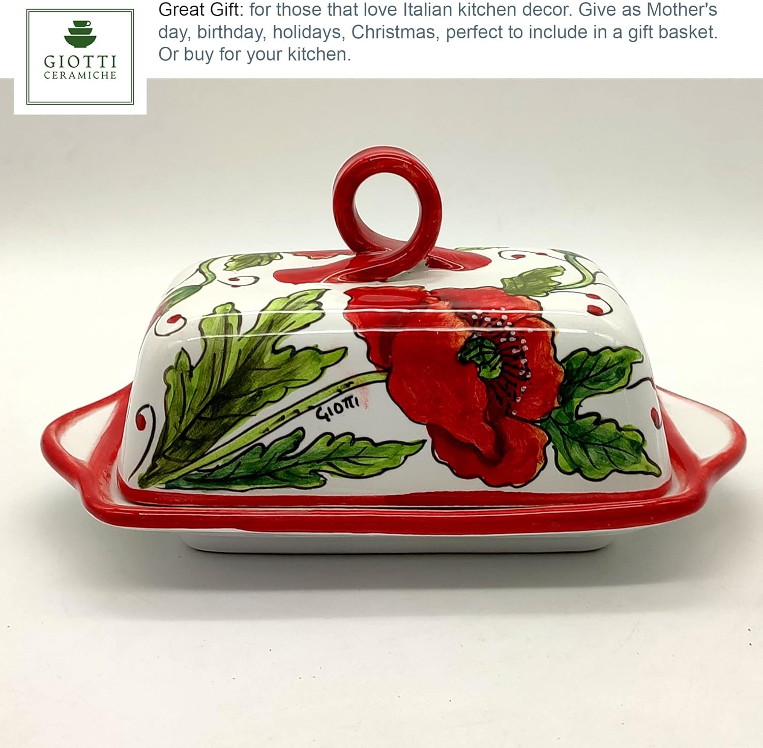 This stylish tuscan butter dish with lid for countertop in Red Poppies Design for kitchen brings Italy to your home . Ceramic multi color Butter container is hand painted With Red Poppie Design. Tuscan decor easily creates the classic chic look for home kitchen, bistro, restaurant. Coordinate with other Tuscany kitchen decor or create nice ambiance when serving any Italian meal..✔This italian Butter dispenser is made by hand in Tuscany - Italy.The hand painted covered butter dish is 8,26 inch x 5,11 inches . This Lemon Sunflower Design kitchen accessories is made with material with a high quality finish gloss that not only looks stylish but can be used for kitchen..✔Perfect for parties and entertaining, or everyday use!, this multi-colored Ceramic tuscan dinnerware.✔This cheese container for fridge is ceramic is hand-painted in Italy, It serves as both a decorative ceramic as well as a functional kitchen accessory making it a great gift for any home✔This butter holder for counter is essential for kitchen or restaurant. The colorful top is also suitable as a decorative object on any shelf✔Top Quality: High quality ceramic Our Tuscany kitchen accessories are handed painted..✔Great Gift: for those that love Italian kitchen decor. Give as Mother's day, birthday, holidays, Christmas, wedding, housewarming and hostess gifts, perfect to include in a gift basket. Or buy for your kitchen...These vibrant designs will maintain their color. Dishwasher, microwave and food safe.Giotti Ceramiche - Florence Italy -