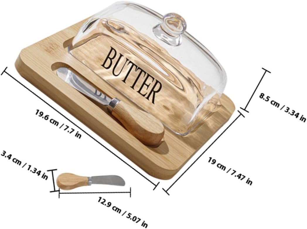 Package Include 1 x butter tray 1 x dome 1 x cutter Characteristics -Size:12.90X3.40X2.00cm/5.07X1.34X0.79in -Product Info:Butter box -Material:Wood, glass, stainless steel -Size:19.60X19.00X8.50cm/7.70X7.47X3.34in -Color:Transparent - Save your time and keep the butter fresh, convenient for home bakery and cooking butter container with lid. - The butter container with lid is suitable for most brands of butter, brings great convenience for you. butter dish with lid - Simple appearance and good workmanship ensuring its popularity and practicality butter dish for homemade butter. - Our is used for holding butter, and can also be put in the freezer for next cooking prepare butter preservation dish. - The lid helps to keep the butter stick or margarine fresh in the freezer, without mixing the odor of other foods clear butter dish with lid.Goods Descriptionbutter dish with lid Fine workmanship, it ensuring the practicality.butter dish with dome This Butter Storage Case is made of wood material with clear glass dome and stainless steel cutter tool, which can withstand the lasting use.clear butter dish with lid Features the good material, which has high durability, not easy to deform