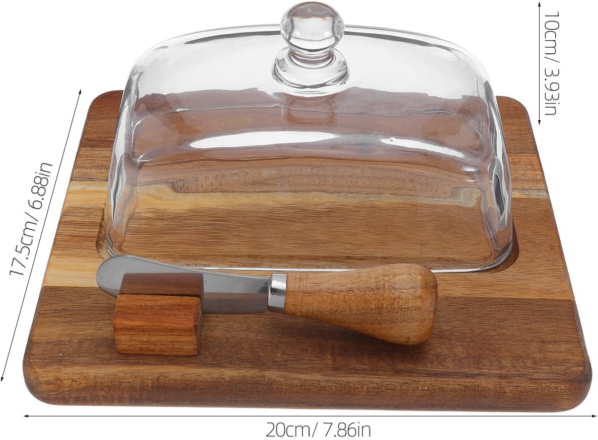 Description Add a touch of sophistication to your dining space with this butter dish with wood lid and clear glass cover. Designed as a butter storage dish for breakfast trays, it includes a special butter spreading knife, ensuring easy application. This dishwasher safe glass butter dish is perfect as a butter saver for counter or as a modern butter container for various occasions. Features -Color:Multi -Material:Wood, glass -Size:20.00X17.50X10.00cm/7.86X6.88X3.93in -Timeless wooden & glass fusion: the country butter dish marries natural wood and plain glass for a rustic yet modern butter counter holder, perfect for displaying on any table or kitchen counter -Keeps butter creamy & fresh: the airtight covered butter dish preserves butter at ideal consistency, reducing spoilage—an ideal butter keeper dish for countertop and table top butter dish needs -Dedicated serving knife: comes equipped with a spreading knife, this butter storage dish lets you serve slices, elevating both family breakfasts and elegant dinner table settings -Functional covered tray: doubles as a cheese dish with glass cover, allowing for multipurpose use as a covered tray for food items and making it a practical addition to your kitchen -Quick and easy cleanup: the dishwasher safe glass butter dish and easy wiping wooden base speed up kitchen maintenance, providing a butter saver dish that’s both beautiful and loweffort