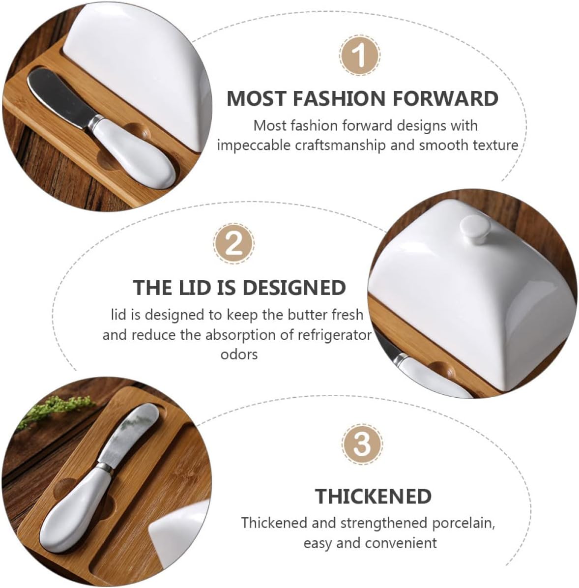 Package List 1 1 1 x butter cutter Features - Size: Approx. 15.00X15.00X9.00cm/5.89X5.89X3.54inch Butter Plate for Hotel. - Material: Wood and Ceramic Butter Container. - The lid is designed to keep the butter and reduce the absorption of refrigerator Butter Plate with Lid. - The base is designed to keep the butter in place while cutting or moving to prevent dirtying the lid Home Dish. - It is rust resistant and will not lose its over Plate for Home. - Thickened and strengthened porcelain, easy and convenient Household Supplies. - ColorAssorted Color Household Storage Tableware - Most fashion-forward designs with impeccable craftsmanship and smooth texture Butter Plate.Goods InformationCeramics Plate for is one of the for you.Home Dish Are you looking for a professional, yet butter plate? Are you in search of a sturdy, trustworthy tool that can do multiple jobs at once? , ! Our professional glass butter plate with a cover and a cutter meet you needs