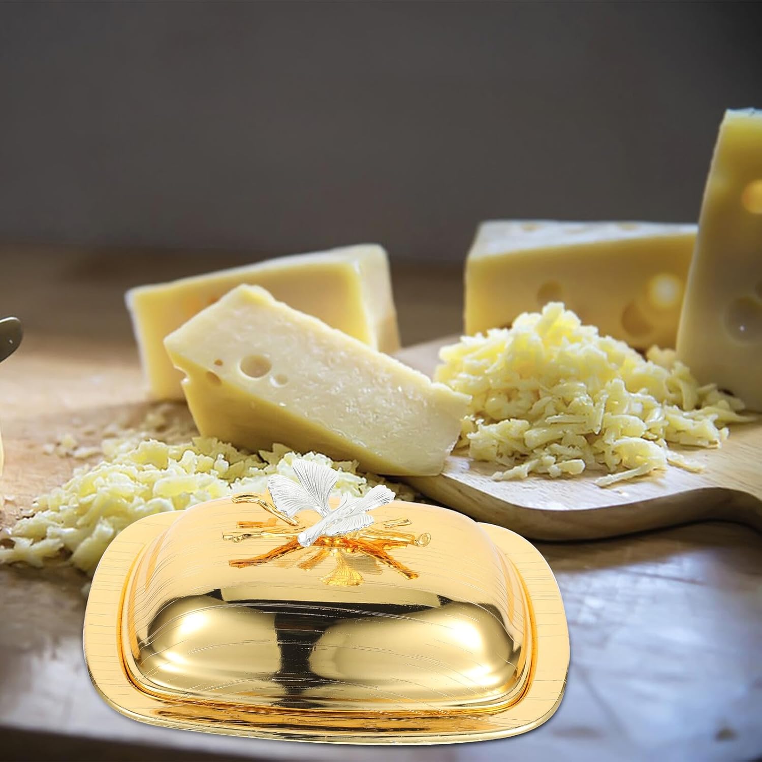 Package List 1 x butter dish Features -Size:16.60X16.60X8.70cm/6.52X6.52X3.42in -Material:Iron -Size:19.00X14.00X8.50cm/7.47X5.50X3.34in -Product Info:Butter dish with cover -Size:19.20X14.00X8.50cm/7.55X5.50X3.34in -The lid is designed to keep the butter or snacks fresh and reduce the absorption of refrigerator odors Kitchen Butter Holder. -Simple , but very practical in use, which brings great convenience to you serving dishes. - ColorGolden -Made of iron materials, Butter Holder is and practical enough to use. Suitable for restaurants, dessert shops, kitchens, for your own use, or as a to a friend. -The European style makes this dish a delicate addition to your dining table, refined and functional butter container. -Clean, compact, and modern design complements any kitchen. Keeps the butter and spreadable butter holder.Goods Informationbutter container with lid This fresh keeping Butter Holder is perfect for storing and keeping fresh your butter, cream or cheese.kitchen cheese holder Adoption of iron material, this item is , handy and long-time use.kitchen storage containers With cover design, convenient storage and keep food fresh and clean