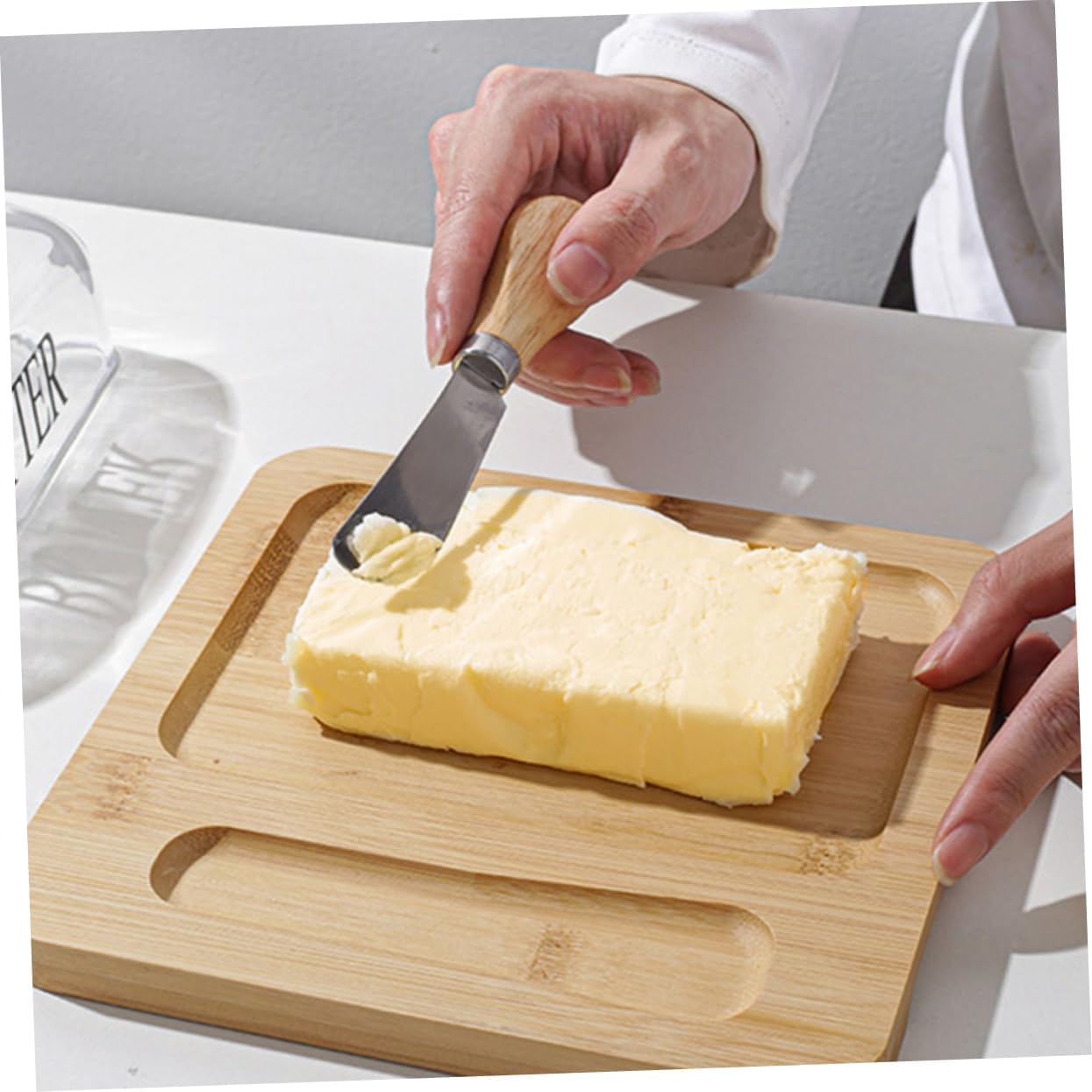 Package Include 1 x butter tray 1 x dome 1 x cutter Features -Size:19.60X19.00X8.50cm/7.70X7.47X3.34in butter Preservation box -Size:12.90X3.40X2.00cm/5.07X1.34X0.79in home tableware -Material:Wood, glass, stainless steel cheese dish -Color:Transparent butter Box with Cutter - Save your time and keep the butter fresh, convenient for home bakery and cooking butter reusable box. - The lid helps to keep the butter stick or margarine fresh in the freezer, without mixing the odor of other foods butter cutting tool. - Our Butter Case is used for holding butter, and can also be put in the freezer for next cooking prepare butter preservation dish. - Simple appearance and workmanship ensuring its popularity and practicality Refrigerator butter box. - The butter container with lid is suitable for most brands of butter, brings great convenience for you. butter box for homeGoods Informationbutter case with lid This Butter Storage Case is made of wood material with clear glass dome and stainless steel cutter tool, which can withstand the lasting use.transparent butter container Fine workmanship, it ensuring the practicality.butter storage dish Features the material, which has high durability, not easy to deform