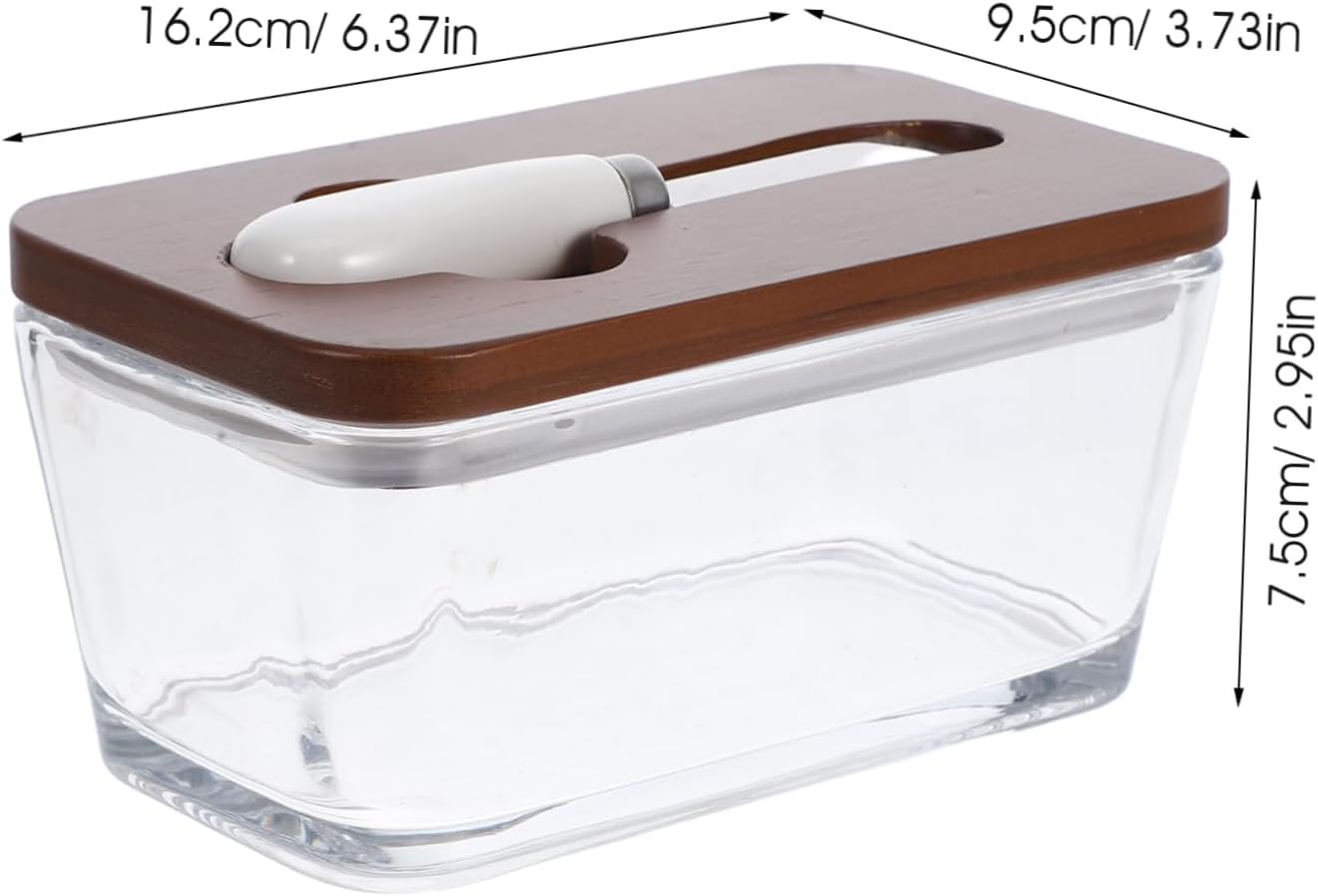 DescriptionKeep your butter to use with this glass butter dish featuring an airtight seal and bamboo lid. The transparent design allows you to see the contents, while the bamboo lid adds a touch of sophistication. The included knife holder you can easily spread your butter, making it a must-have for any kitchen.Features- Color: Brown-Material:Glass,bamboo - Size: 16.20X9.50X7.50cm/6.37X3.73X2.95in -Freshness use: the airtight seal your butter stays longer, maintaining its delicious taste-Versatile functionality: suitable for storing butter, cheese, and other food items, making it a versatile kitchen tool-Portable and convenient: the lid and knife design make it easy to carry, It's for enjoying butter on the go-Easy to clean: the smooth surface makes cleaning effortless, ensuring your butter keeper remains spotless-Elegant design: the stylish appearance adds a touch of elegance to your kitchen, enhancing its aesthetic appeal