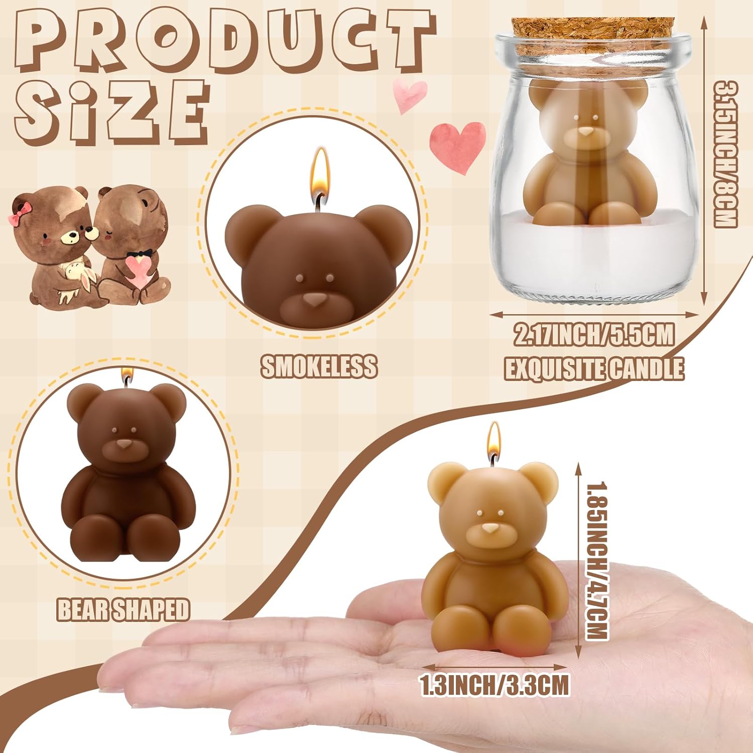 Features: Present Embrace the beauty of our charming bear-shaped aesthetic candles, crafted from soy wax. Available in an enchanting palette of brown, pure white, and creamy white, these candles offer a soothing ambiance that complements any decor. The 2.20 x 2.83 inches size is ideal for creating cozy yet stylish spaces. Customers consistently praise the gentle, natural scent and longer burn time, meeting their needs for sustainable and elegant home accessories. Versatile and Abundant Transform your space with our set of 20 bear-shaped candles, ideal for a variety of occasions. From intimate gatherings to everyday moments, these decorative pieces enhance the atmosphere, providing both aesthetic and functional value. Whether placed on a dinner table or applied as a special decor accent, their appealing design and ample quantity ensure you never run out of ways to enhance your surroundings. Enjoy the serene glow and special style that these candles bring to your home. Specifications: Material: soy wax Color: brown, pure white, creamy white Size: 2.20 x 2.83 inches (5.6 x 7.2 cm) Package includes: 20 Charming bear-shaped aesthetic candles Notes: Manual measurement, please allow slight errors on size. The color may exist a slight difference due to different screen displays