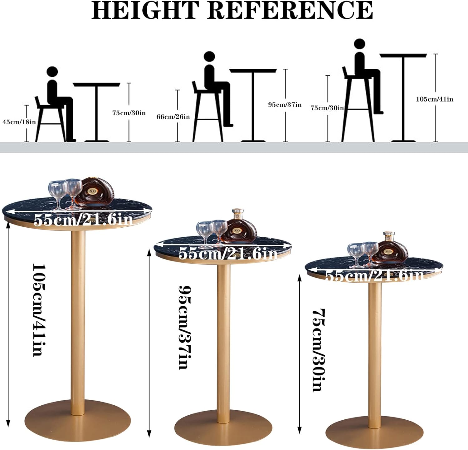 Wall-Mounted L-Shape Bracket Cocktail Table: Name: Cocktail High Table Color: white+gold Specification: desktop diameter 55cm/22in, height 75cm/30in, 95cm/37in, 105cm/41in, base diameter 45cm/17.7in Material: marble, iron frame Style: modern and simple Function: storage The simple and aesthetic shape is the characteristic of the bar table. It is not only an advantage in appearance, but also a practical product. The marble table texture is beautiful and improves your life quality. The table is not easy to scratch and stain, and the tea stain is easy to clean, The iron material of the table leg is simple and beautiful. The table leg is made by an old craftsman, and the mechanical design has strong bearing capacity. The circular base is evenly stressed, not easy to shake left and right, and has high temperature antirust paint baking, and long service life. The simple design of bar table is applicable to any place, coffee shop, dessert shop, bar, 4S shop, living room, kitchen, etc. 1. Due to the light and monitor display during the photo shooting process, the color of the photo may be slightly different from the real object. Please refer to the goods received. 2. If the product size is measured manually, there may be an error of 0 inch to 0.78 inch. 3. If you have any quality problems after receiving the goods, please contact us within 24 hours, and we will provide you with solutions within 12 hours.