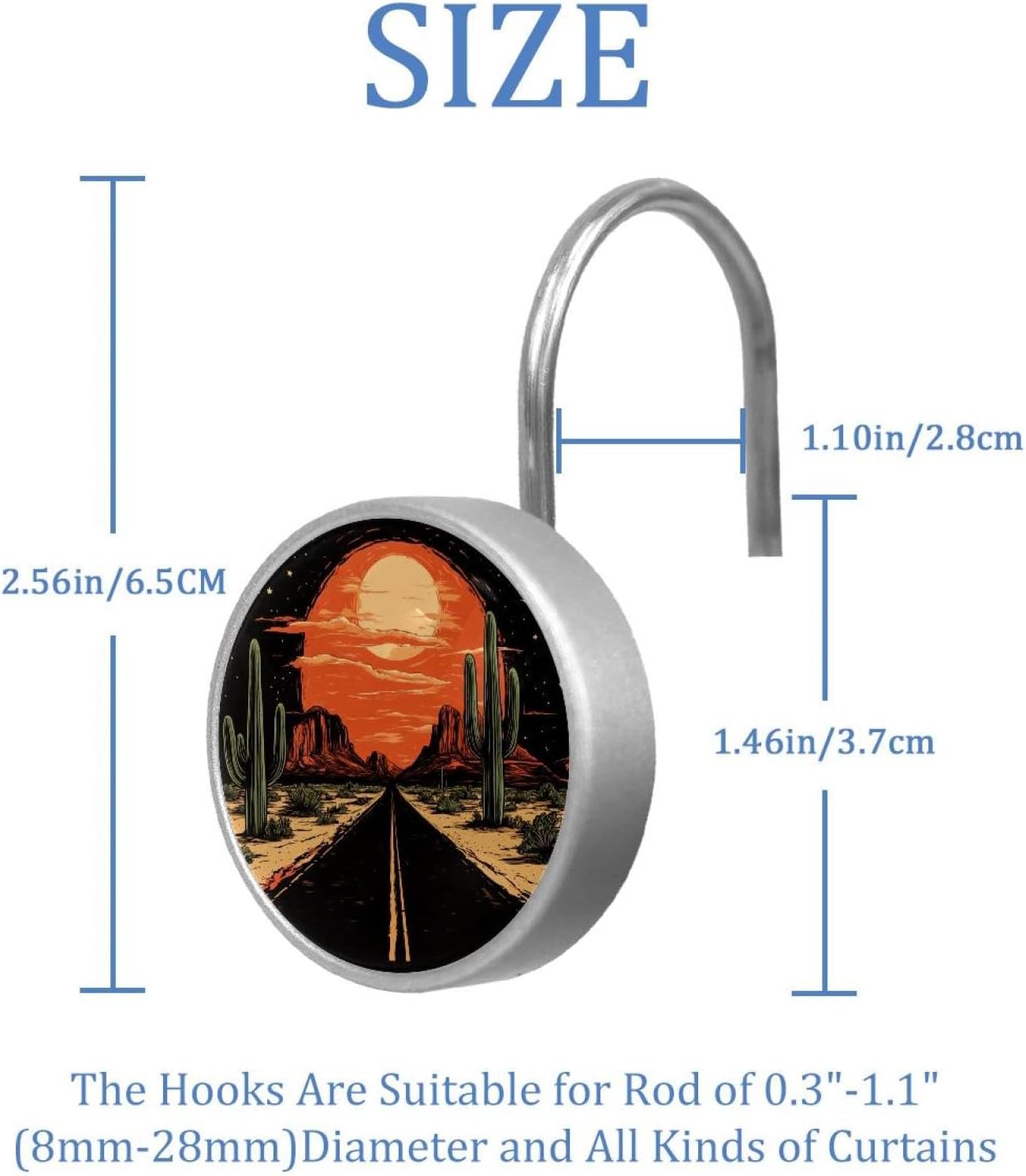 MATERIAL: glass, stainless steel. These shower curtain hooks can be decoration bathroom and will be long-lasting.12 pieces of shower curtain hooks, round crystal glass decoration, printed patterns, silver hooks to match various styles of bathroom shower curtains. SIZE: Crystal glass diameter of round shower curtain hook is 1.45x1.45in/ 3.7x3.7cm. The shower curtain hooks diameter is about 1.1in, 12 pieces shower curtain hooks are suitable for rod of 8-28mm(0.3"-1.1"). RUST RESISTANT:Shower hooks are made of stainless steel and crystal glass, which is durable, rust-proof and corrosion-resistant, it will not rust suitable for wet bathroom environment. EASY TO INSTALL:Hand the shower curtain hooks hold securely on straight or curved shower curtain rods,slid easily and smoothly. Easy to install and decorate your bathroom. BEAUTIFUL AND ELEGANT:Beautiful Love hook add charming scenery for your bathroom, baby room, bedroom, living room, and the gorgeous style is easy to match with any kinds of bathroom shower curtain. EASY GLIDE: Open and close your shower curtain quickly and easily with the Shower Hooks, easily glides on shower curtain rods and tension rods. No snagging; no effort; no hassle PACKAGE: 12 shower curtain hooks in a pack.The bathroom curtain hook has a smooth appearance and can be hung on the pole to pull it at will. Special price 12 sets to meet your needs.