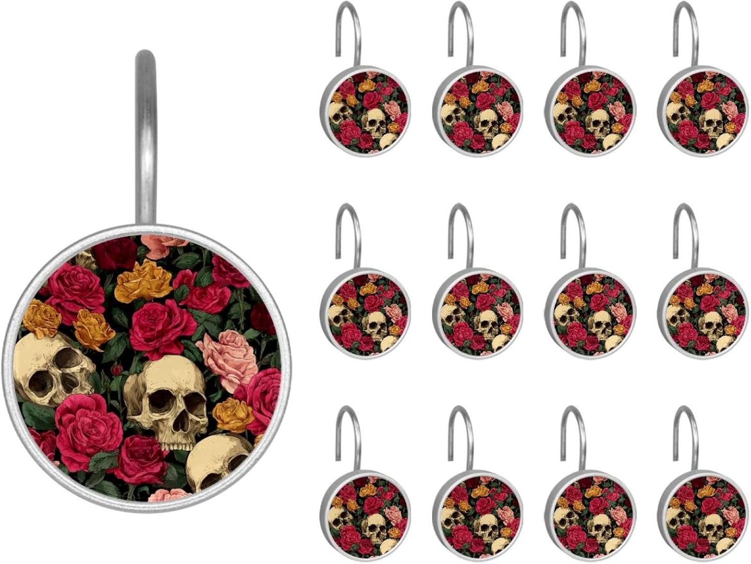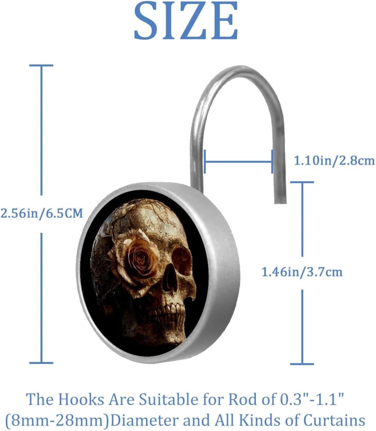 MATERIAL: glass, stainless steel. These shower curtain hooks can be decoration bathroom and will be long-lasting.12 pieces of shower curtain hooks, round crystal glass decoration, printed patterns, silver hooks to match various styles of bathroom shower curtains. SIZE: Crystal glass diameter of round shower curtain hook is 1.45x1.45in/ 3.7x3.7cm. The shower curtain hooks diameter is about 1.1in, 12 pieces shower curtain hooks are suitable for rod of 8-28mm(0.3"-1.1"). RUST RESISTANT:Shower hooks are made of stainless steel and crystal glass, which is durable, rust-proof and corrosion-resistant, it will not rust suitable for wet bathroom environment. EASY TO INSTALL:Hand the shower curtain hooks hold securely on straight or curved shower curtain rods,slid easily and smoothly. Easy to install and decorate your bathroom. BEAUTIFUL AND ELEGANT:Beautiful Love hook add charming scenery for your bathroom, baby room, bedroom, living room, and the gorgeous style is easy to match with any kinds of bathroom shower curtain. EASY GLIDE: Open and close your shower curtain quickly and easily with the Shower Hooks, easily glides on shower curtain rods and tension rods. No snagging; no effort; no hassle PACKAGE: 12 shower curtain hooks in a pack.The bathroom curtain hook has a smooth appearance and can be hung on the pole to pull it at will. Special price 12 sets to meet your needs.