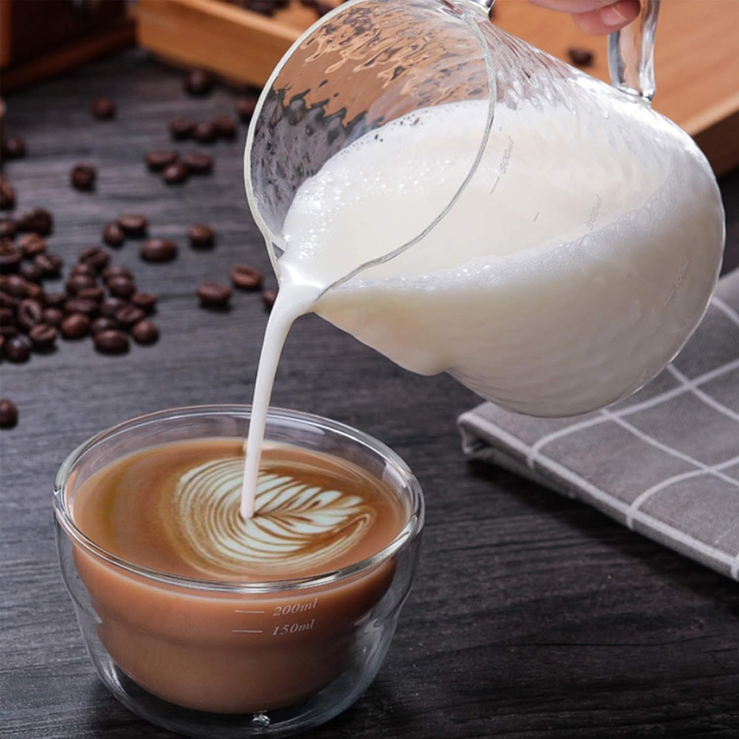 FEATURE:Which is an ample supply of liquid, yet is small enough to conserve needed fridge space.Material: High borosilicate glassThe ultimate tool for the home barista, used for frothing milk and much more.The milk frother jug can be used in different ways, featured with a latte art pen which can shape kinds of beautiful coffee pattern.PLEASE NOTE:1.Color might be slightly different due to the color calibration of each individual monitor.2.Please allow measuring deviation due to manual measurement.3.Thanks for your understanding and enjoy your shopping moment!PACK LIST:1 * Milk Pitcher