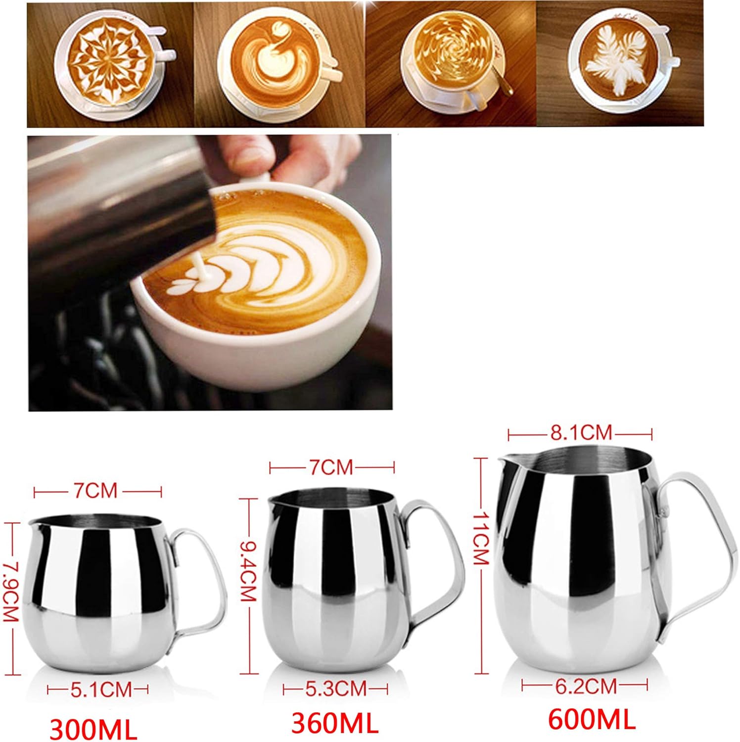FEATURES:1. Beautiful stainless steel design, seamless design with small pour spout.2. Mirror surface treatment, smooth and glossy, thicken stainless steel jug body and handle, more durbale and comfortable to use.3. Made using of solid stainless steel material, with high speed heat conduction, the temperature can be easily felt by hand touch.4. With concise and beautiful appearance, heat resistance and firm, easy to clean and sterilization.5. Convenient and easy to make beautiful and professional cappuccino garland coffee and various pattern.6. A must have for coffer lovers,suitable for home and coffee shop, hotel use.SPECIFICATION:Material: Stainless steelColor: Silver Thickness: About 1.2mm (aftre polishing real thickness is about 1mm)Capacity: 300ml,350ml,600mlNOTES:1. Due to the different monitor and light effect, the actual color of the item might be slightly different from the color showed on the pictures. Thank you!2. Please allow 1-3cm measuring deviation due to manual measurement.PACKAGE:3 x Drum-shape Milk Frothing Jug