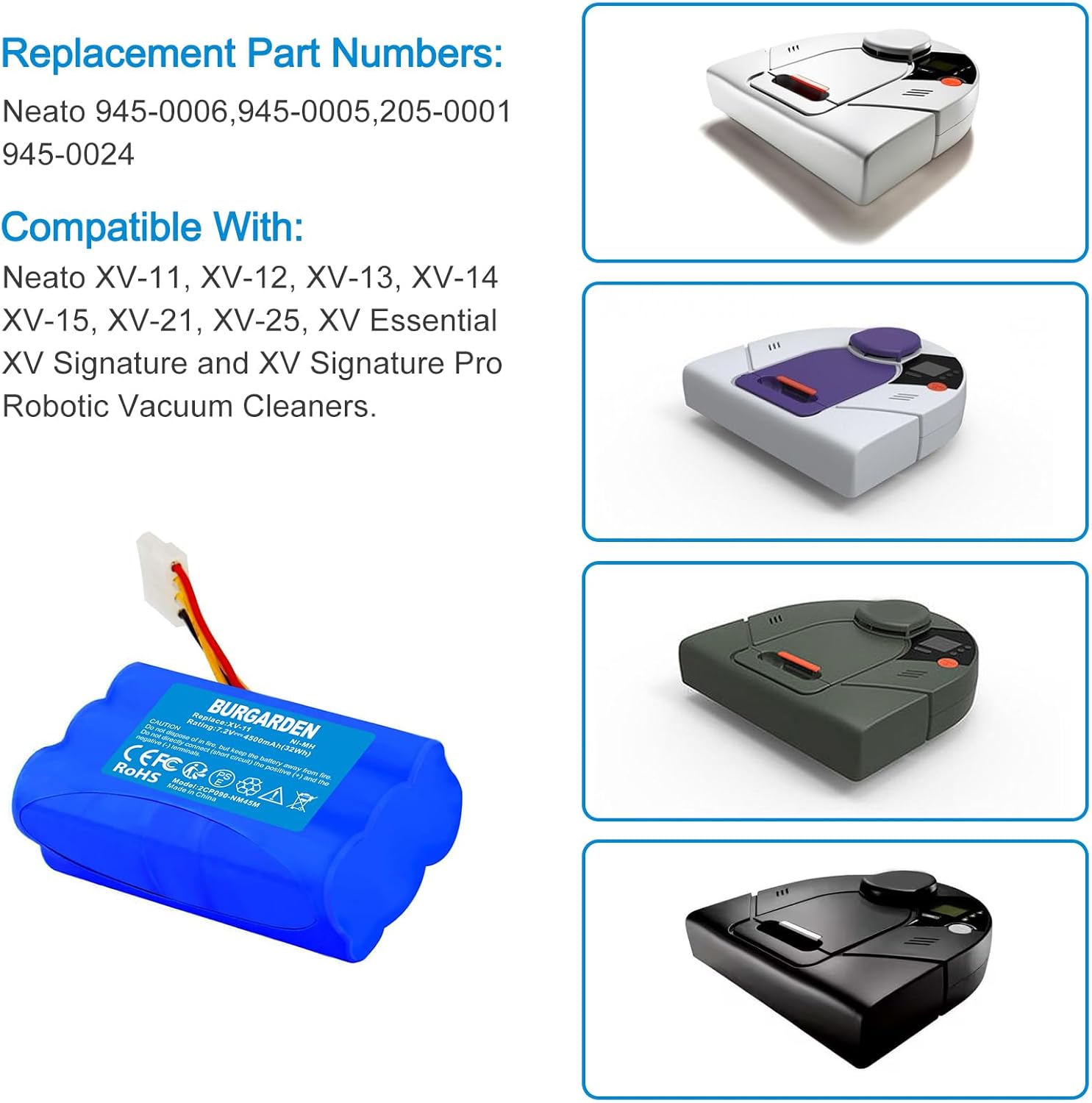 | Compatible Phone Models | Neato 7.2V XV-11, XV-12, XV-13, XV-14, XV-15, XV-21, XV-25, XV Essential, XV Signature and XV Signature Pro, 945-0005, 205-0001, 945-0006, 945-0024 battery |