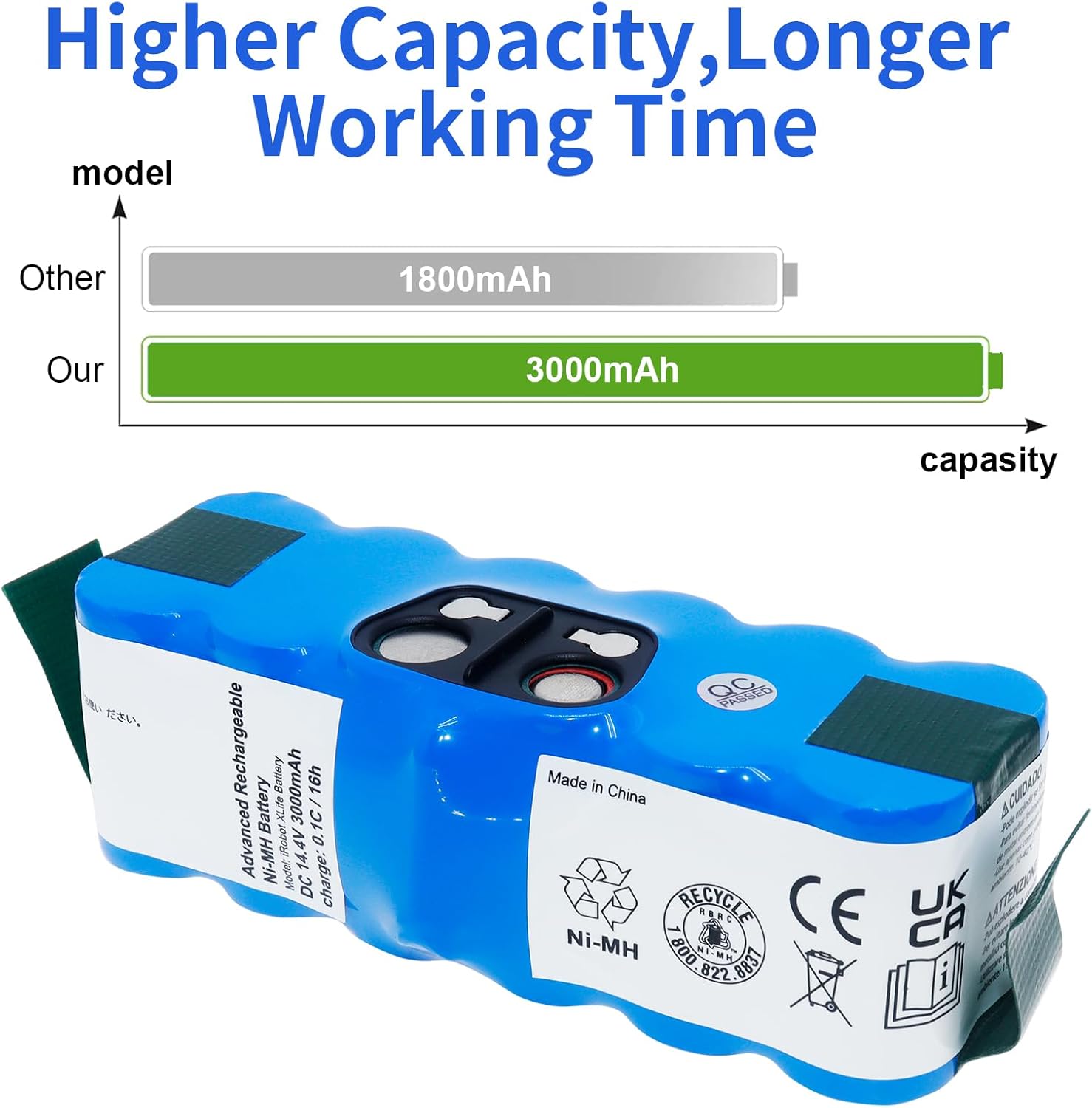 Specifications:Battery type:NI-MH Battery Voltage:14.4VCapacity:3000mAhReusability: Rechargeable Replacement Battery for iRobot Roomba 500, 600, 700 & Select 800 Series, Create 2, Scooba 450 ,For iRobot Roomba 500 510 520 530 532 535 540 545 550 552 555 560 562 570 580 581 582 585 595 600 610 620 630 631 650 660 700 760 770 780 790 800 870 880 R3
