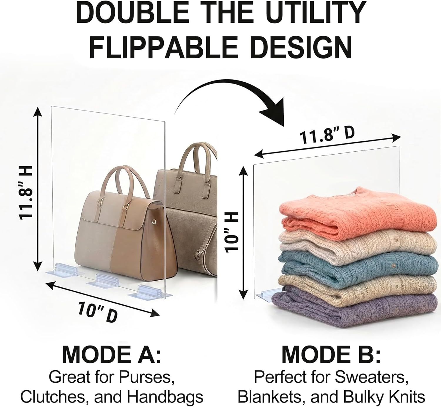 Transform Your Messy Shelves into a Haven of Organization with Our Crystal Clear Acrylic Shelf Dividers! Achieve flawless closet organization with our 4-pack of clear shelf dividers. Each set of these acrylic shelf dividers is designed to fit top shelves, cabinets, and is perfect as shelf dividers for wire shelves. Sized at 10” D x 11.8” H, these closet shelf dividers can be flipped to 11.8” D x 10” H, offering customizable closet shelf organization closet shelf dividers for wood shelves can be flipped to offer customizable organization. Ideal as cabinet dividers or for creating a tidy sweater organizer shelf, these shelf organizers dividers Transform your closet in seconds! The innovative clipless design of these acrylic dividers for closet allows for quick setup and removal on any shelf thickness without leaving a trace. These self dividers for closets are the perfect solution for wood shelves, making them the ultimate closet shelf organizer. Discover the endless possibilities with our versatile dividers for shelves. Perfect as a sweater organizer for closet shelf, these clear closet dividers neatly store everything from handbags and shirts to documents. Use them as purse shelf dividers, a shirt organizer shelf, or even pantry shelf dividers to maintain a pristine look. These closet separators for clothes Crafted from high-quality acrylic, our shelf dividers for closet organization are crystal clear, lightweight, and built to last. Safer than glass, these acrylic closet organizers and storage feature smooth, rounded corners to protect your clothes and shelves. The modern design of these clear shelf dividers makes them ideal acrylic closet shelf dividers. These clothing dividers for shelves are perfect as a purse organizer for closet shelf or towel organizers and storage for linen closet. The chic look of these acrylic shelf dividers for closets