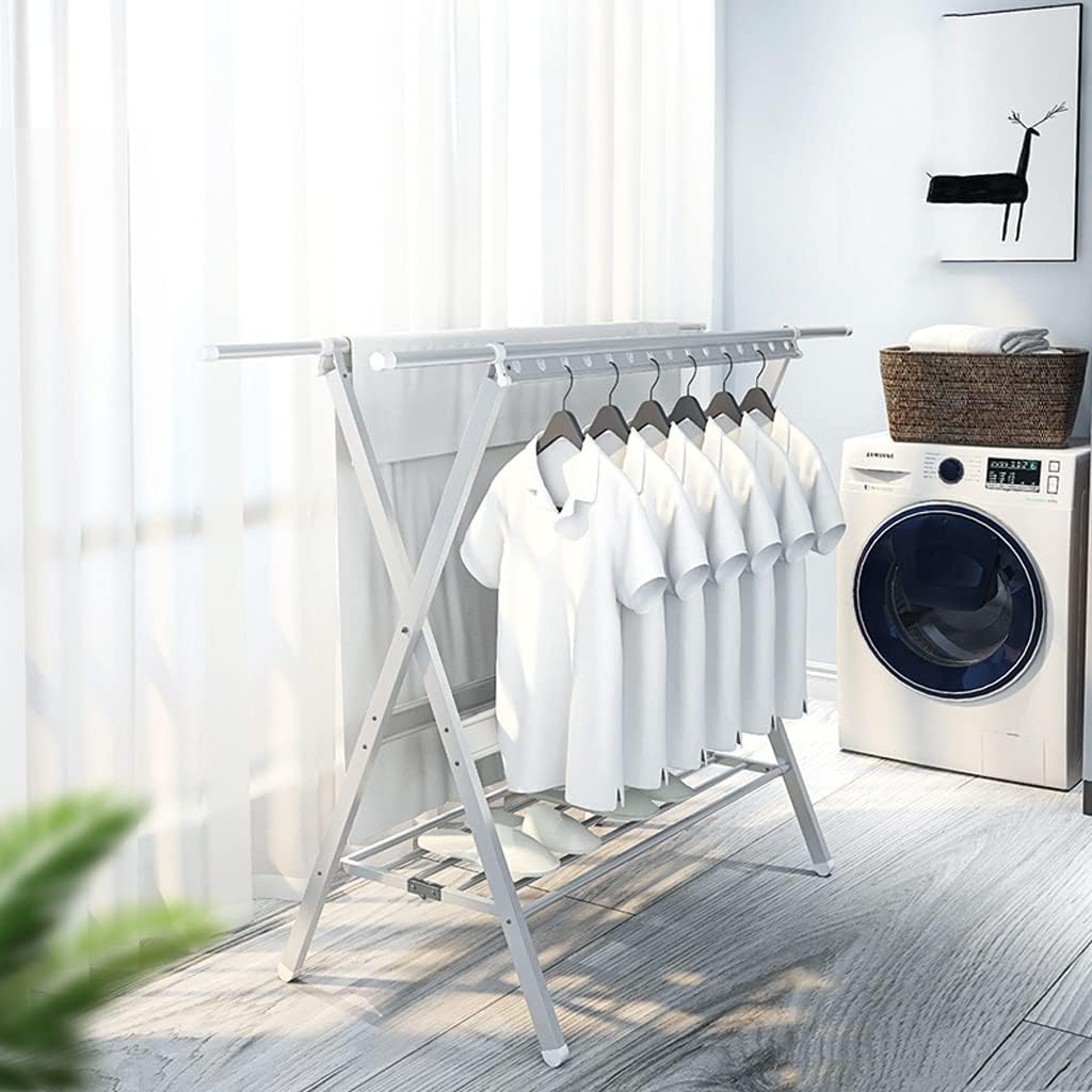 Features:Foldable and retractable to save space without installation tools, 8 seconds to fold without taking up space.Aluminum alloy material, X-shaped drying rack, rose gold color, not only beautiful and excellent load-bearing capacity.Detachable pulleys can be easily moved without noise, wind-proof feet and wind-proof hanging holes, no need to worry about overlapping clothes in the outdoors, no need to worry about toppling in strong wind.Hanging holes in the upper layer to dry clothes and quilts, and the lower shelf to dry pillows and shoes is more convenient.this organizer is not only powerful, but also beautiful and exquisite. Material: Aluminum alloyColor: SilverSize: 137cmPackage Includes:1 x drying rackNotes:Due to the light and screen setting difference, the item's color may be slightly different from the pictures.Please allow slight dimension difference due to different manual measurement.The wide shoulder design of the hanger provides sufficient support for your suits, coats, and other types of clothing.