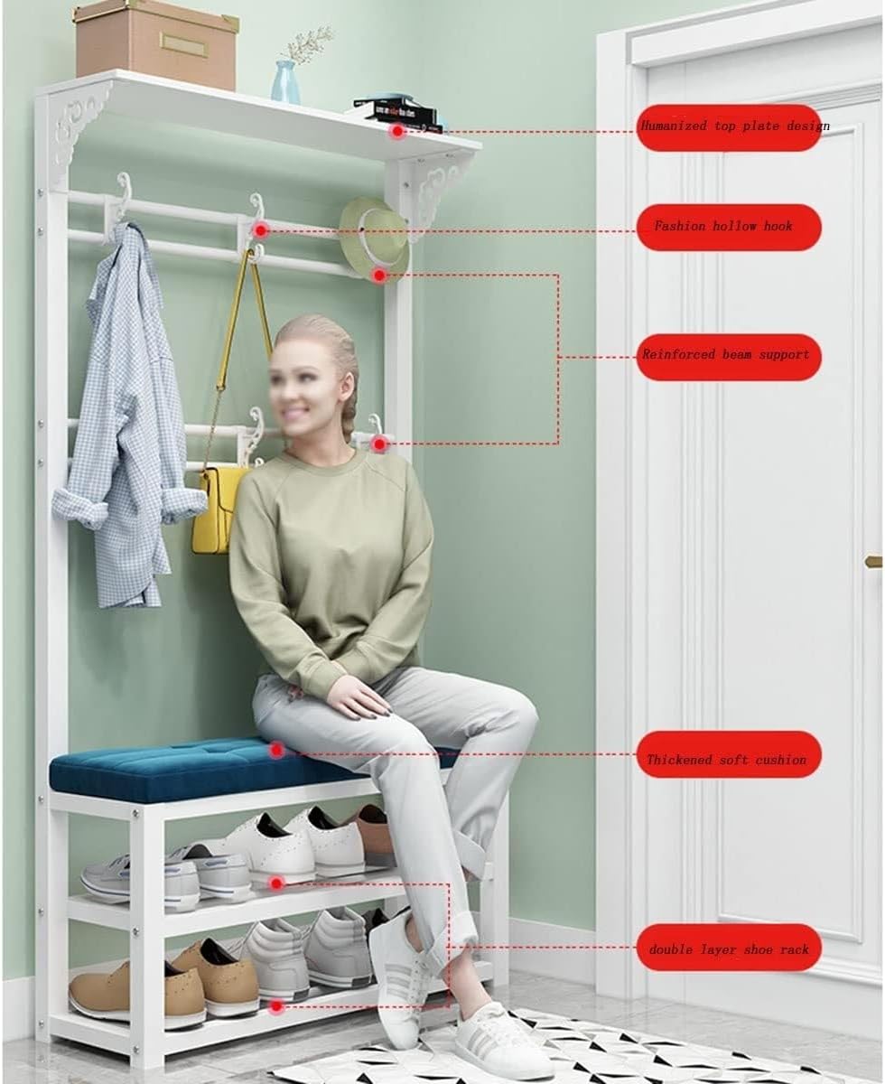 Upgrade your home organization with the Floor-Standing Solid Wood Rotating Coat Rack with 2-Tier Shoe Cabinet. This stylish and multi-functional storage solution combines coat hanging, shoe storage, and seating into one versatile unit. Featuring a cushioned stool made from soft flannel fabric and waterproof PU leather, it offers comfort while you change shoes, making it an ideal choice for busy mornings or relaxing after work.Crafted with carbon steel pipe and a thickened iron frame, this organizer is built for durability and stability, capable of supporting your shoes, coats, handbags, and other accessories. The 2-tier shoe rack helps keep your footwear organized, while the rounded hooks prevent damage to your clothes, offering both functionality and protection.With its sleek black PU leather design, this piece fits effortlessly into your entryway, hallway, or bedroom, making it a perfect blend of style and practicality. The dust-proof top plate design keeps your shoes clean, while the adjustable foot pads prevent floor scratches and provide additional stability.Whether you're looking for a space-saving storage solution or simply want to declutter your living area, this 4-in-1 coat rack and shoe organizer has you covered. With easy assembly and a clear installation guide, this stylish organizer will elevate your home's decor while keeping everything organized and easily accessible.