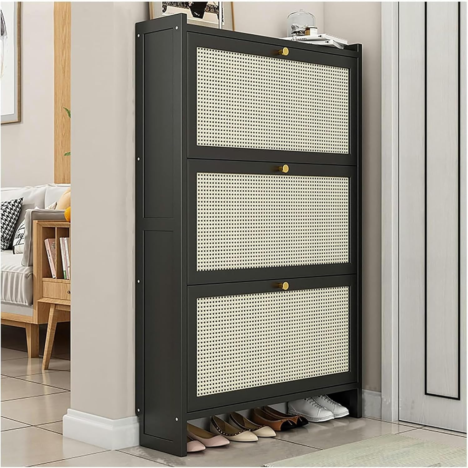 Streamlined Shoe Cabinet for Efficient Shoe Organization Transform your cluttered shoe collection into an organized display with our sleek shoe cabinet. Its compact design fits perfectly into narrow spaces, making it an ideal addition to foyers and entryways while seamlessly complementing your home decor. Convenient Flip-Drawer Design for Enclosed Shoe Storage Featuring a user-friendly flip-drawer design, this shoe cabinet provides enclosed storage for up to 12 pairs of shoes across three spacious drawers. It's a functional and space-saving solution that keeps your footwear neatly tucked away yet easily accessible. Elegant Metal Handles for Effortless Access Each drawer is equipped with stylish metal handles, ensuring a comfortable grip while adding a refined touch to the overall design. This detail not only enhances usability but also elevates the aesthetic appeal of your space. Top Shelf for Small Item Storage and Display Utilize the top shelf to store small items or showcase decorative elements like vases, books, and photo frames. This multifunctional feature enhances both storage and display options, allowing you to personalize your cabinet according to your style. Easy to Clean and Maintain Maintaining this shoe cabinet is simple—just wipe it down with a damp cloth to keep it looking fresh and clean. Its durable materials ensure that it withstands everyday use while retaining its charm. Versatile Placement Options Perfect for various spaces, this shoe cabinet is suitable for entryways, hallways, bedrooms, and living rooms. Whether you're seeking an elegant shoe organizer or a flip-down shoe storage solution, this versatile cabinet meets your needs with style and functionality.