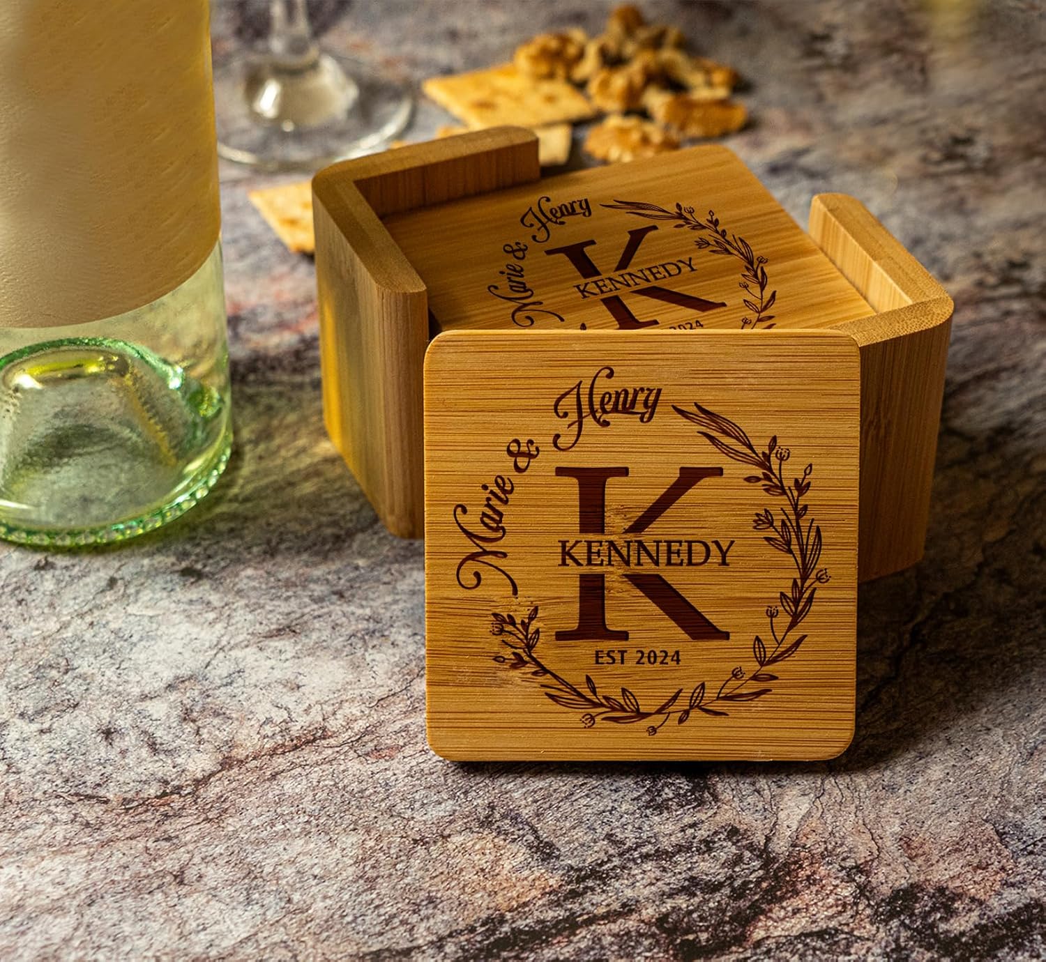 Introducing our Engraved Bamboo Coaster Set of 12 – a timeless expression of love and celebration. Handcrafted from premium bamboo wood, it's designed for personalization, making it a meaningful gift for various occasions, including real estate closings, Christmas, weddings, anniversaries, and housewarming parties. Each coaster is engraved with your chosen message, creating a cherished keepsake that marks special moments with a personalized touch. Ideal for couples, it symbolizes new beginnings, adding warmth and sophistication to any kitchen. This practical and sentimental gift serves as a constant reminder of love and togetherness, making it an ideal present, especially during festive seasons like Christmas. Its versatile design complements any kitchen decor, adding rustic charm to every home. Celebrate love and friendship with our customizable Engraved Bamboo Coaster Set of 6 – a gift destined to be treasured for years. This kitchen essential is more than a tool; it's a symbol of heartfelt connections, making every kitchen and drink moment special and memorable. Whether it's a festive celebration, a wedding, a housewarming, or a real estate closing, this cutting board is the perfect choice to convey your thoughtful sentiments.