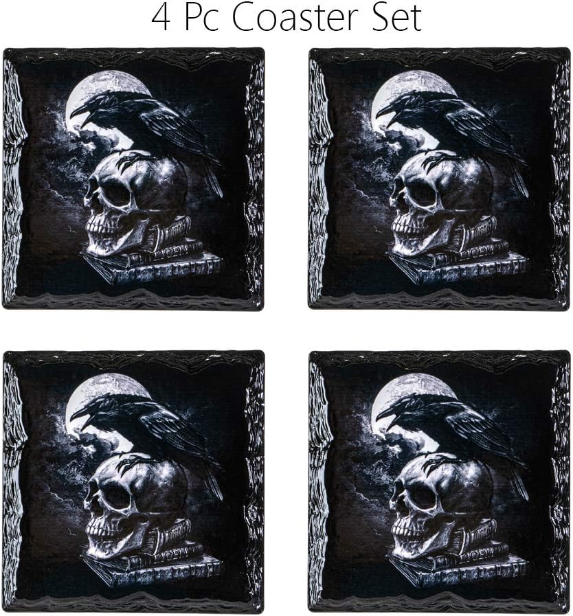 Quoth the raven, "Nevermore." Gothic Tile Coaster Set. Includes 4! Features Black Raven, Full Moon, Skull, and Books. Non-Slip Cork Back. Heat-Proof and Scratch-Resistant. 4.25" L x 4.25" W x 0.25" D. Made of Quality Ceramic Slate. The perfect housewarming gift to haunt any house!