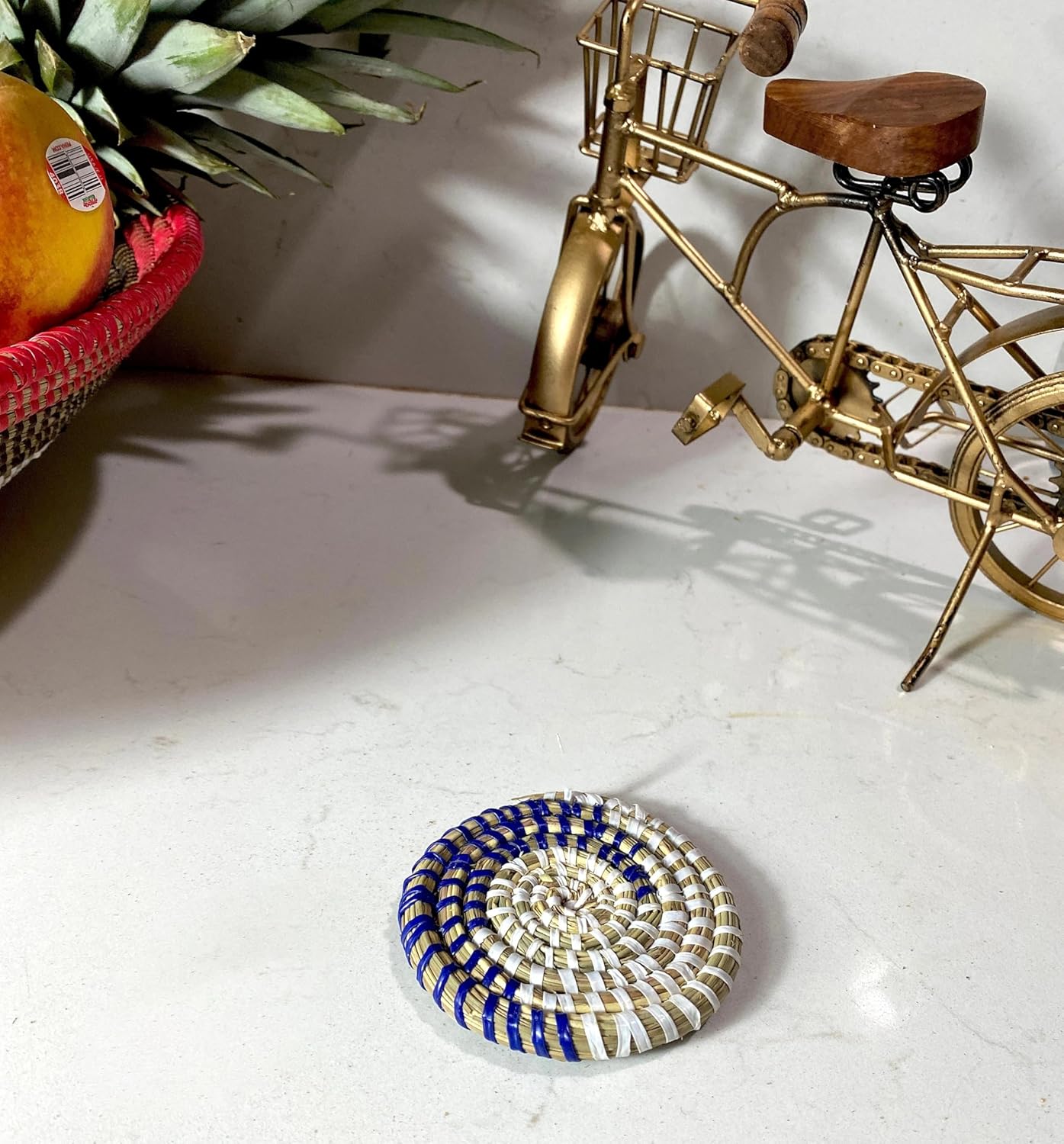 Add a touch of authentic African craftsmanship to your home with this Handmade Senegalese Coasters Set, beautifully woven in purple and white natural grass fibers. Each coaster is carefully handcrafted by skilled artisans in Senegal using traditional weaving techniques passed down through generations, making every set truly one of a kind. Made from durable, eco-friendly woven grass, these coasters are designed to protect your surfaces from heat, moisture, and scratches while adding a warm, artisanal accent to your décor. The vibrant purple contrasts elegantly with natural white tones, creating a timeless yet eye-catching design that complements bohemian, modern, rustic, and global-inspired interiors. Perfect for coffee cups, tea mugs, wine glasses, and cold drinks, these coasters are lightweight yet sturdy, making them ideal for everyday use or special gatherings. Their textured weave provides a stable base for glassware while absorbing condensation naturally. This set of 4 handmade coasters also makes a thoughtful and meaningful gift for housewarmings, birthdays, weddings, or anyone who appreciates handmade, ethically sourced home décor. Because each coaster is individually woven by hand, slight variations in color and pattern may occur—adding to their charm and authenticity