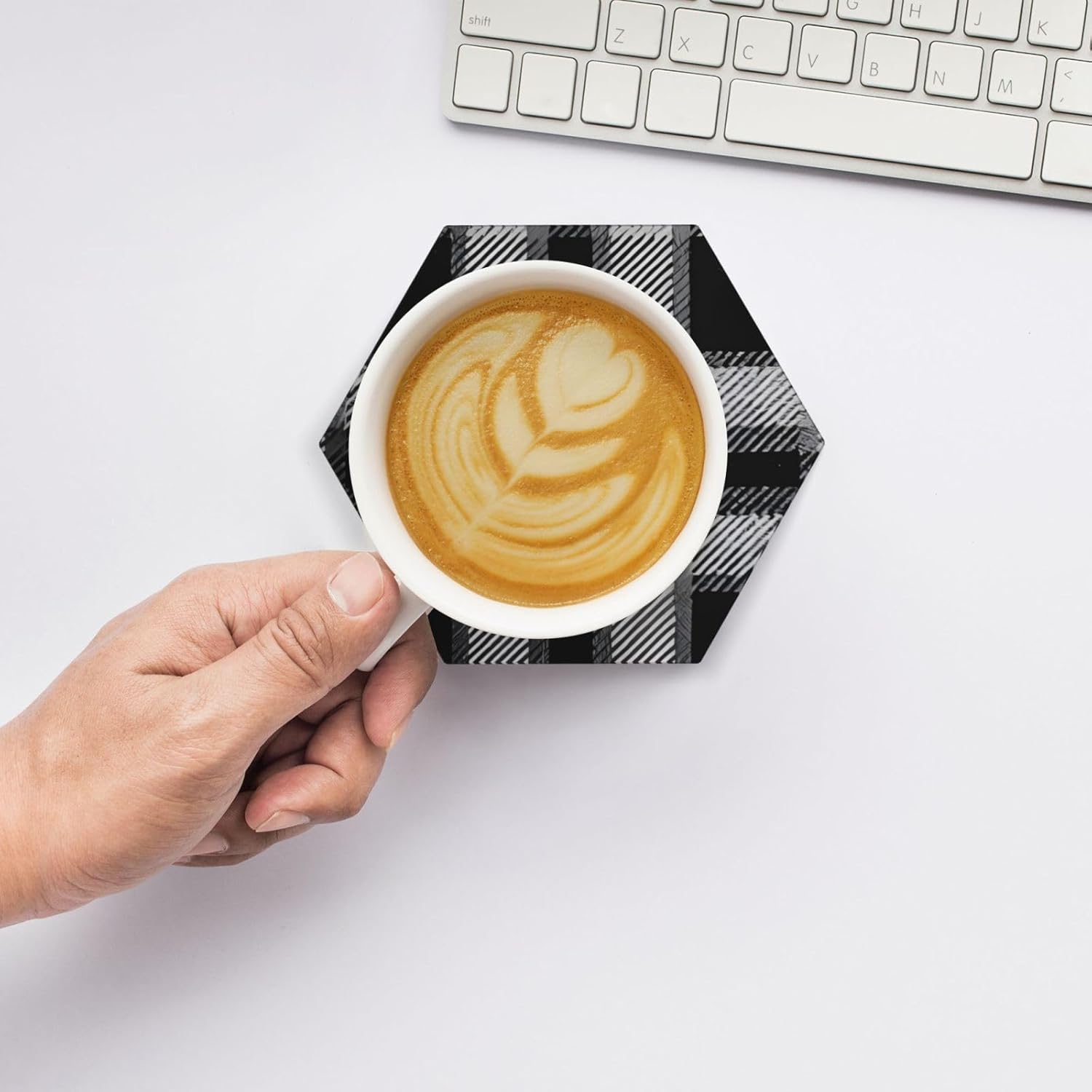 Product Name: DCEHGEW Ceramic Drink CoastersMaterial Type: Ceramic with cork bottomSize: Round: 4.1 x 4.1 inches, Square: 3.9 x 3.9 inches, Hexagon: 4.3 x 3.7 inchesPattern: Black and white plaid About Our Ceramic Absorbent Coasters:Product Features - Crafted from high-quality ceramic, these coasters are odorless and eco-friendly. Their superior absorbency keeps your surfaces dry by quickly soaking up spills from coffee, cola, and other beverages within 10-15 seconds.Applicable Scenarios - Perfect for adding a stylish touch to your kitchen, living room, bar, hotel, or restaurant. These coasters are an ideal present for birthdays, Mother's Day, Father's Day, Valentine's Day, anniversaries, housewarming celebrations, or Christmas.Accessory Structure - Each set includes 6 ceramic coasters with cork bottoms, accompanied by a sleek black metal stand for organized and aesthetic storage. Choose from three different shapes to suit your style and needs.Washing Instructions - Easily clean these coasters with water or a damp cloth.Special NoteDue to different measurement methods, a deviation of up to 0.3 cm in size is considered normal.Please Note:The product images are for reference only. Actual products may vary slightly due to production factors such as batch differences and machine settings. Minor variations in color, position, and size are normal and not considered defects. Thank you for your understanding!Customer Service:We want to make sure you have an amazing experience with us. Please contact us with any feedback you may have. We love to hear from you and usually respond within 12-24 hours.