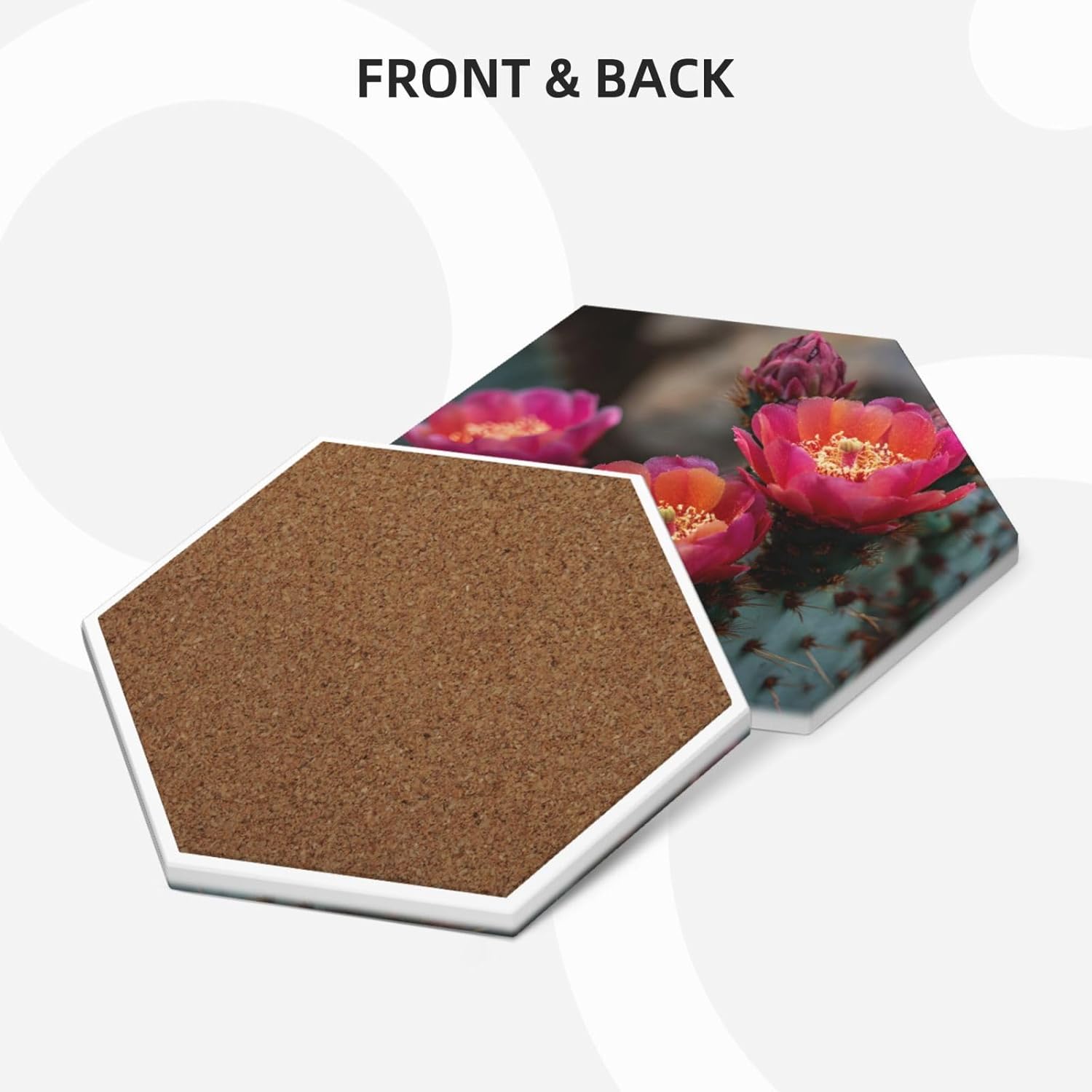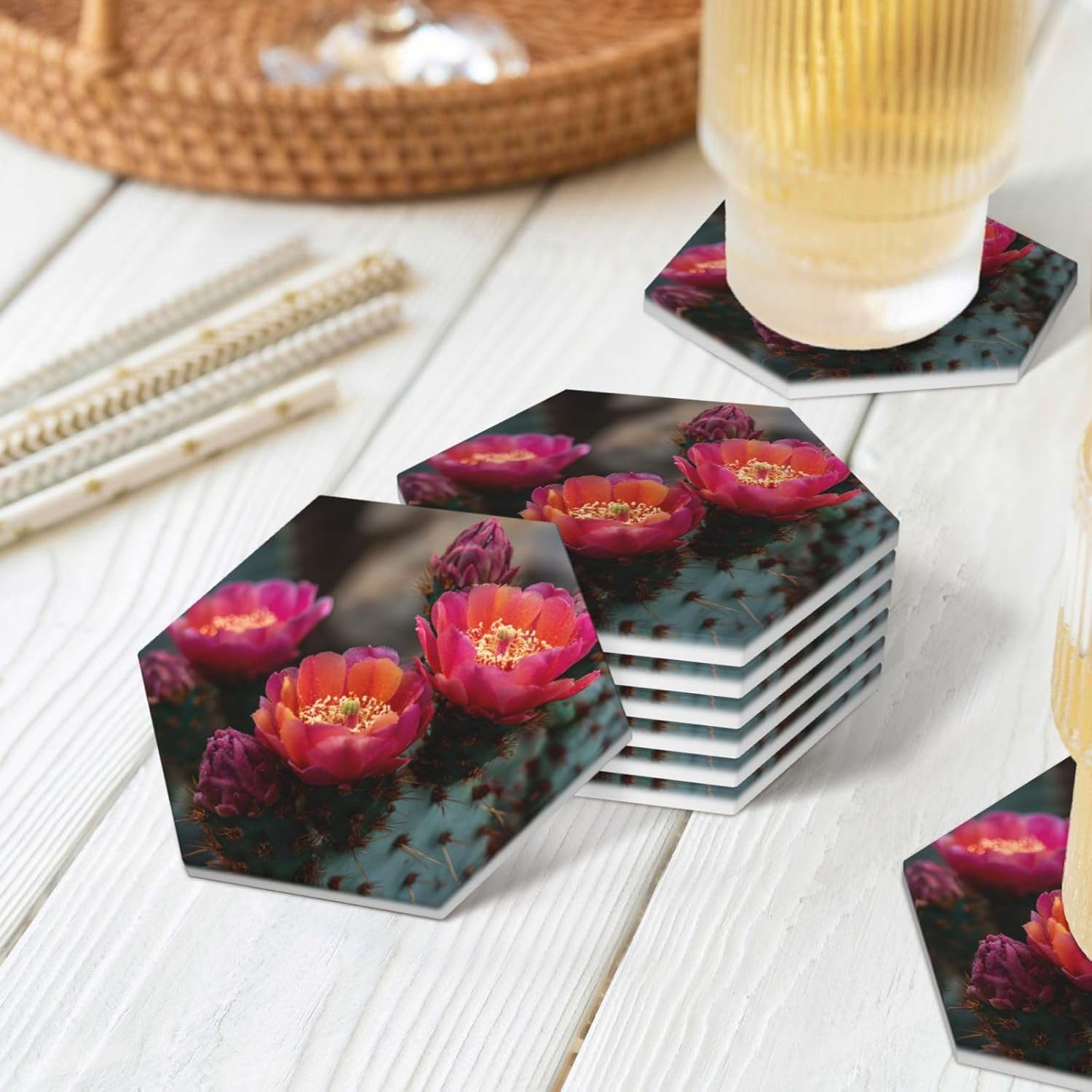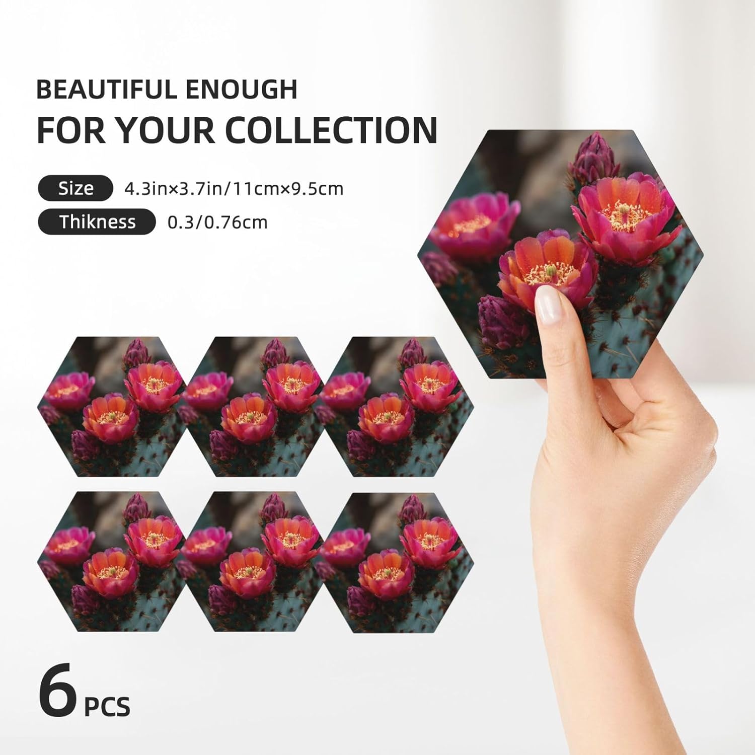 Product Name: DCEHGEW Ceramic Drink CoastersMaterial Type: Ceramic with cork bottomSize: Round: 4.1 x 4.1 inches, Square: 3.9 x 3.9 inches, Hexagon: 4.3 x 3.7 inchesPattern: cactus blooming About Our Ceramic Absorbent Coasters:Product Features - Crafted from high-quality ceramic, these coasters are odorless and eco-friendly. Their superior absorbency keeps your surfaces dry by quickly soaking up spills from coffee, cola, and other beverages within 10-15 seconds.Applicable Scenarios - Perfect for adding a stylish touch to your kitchen, living room, bar, hotel, or restaurant. These coasters are an ideal present for birthdays, Mother's Day, Father's Day, Valentine's Day, anniversaries, housewarming celebrations, or Christmas.Accessory Structure - Each set includes 6 ceramic coasters with cork bottoms, accompanied by a sleek black metal stand for organized and aesthetic storage. Choose from three different shapes to suit your style and needs.Washing Instructions - Easily clean these coasters with water or a damp cloth.Special NoteDue to different measurement methods, a deviation of up to 0.3 cm in size is considered normal.Please Note:The product images are for reference only. Actual products may vary slightly due to production factors such as batch differences and machine settings. Minor variations in color, position, and size are normal and not considered defects. Thank you for your understanding!Customer Service:We want to make sure you have an amazing experience with us. Please contact us with any feedback you may have. We love to hear from you and usually respond within 12-24 hours.