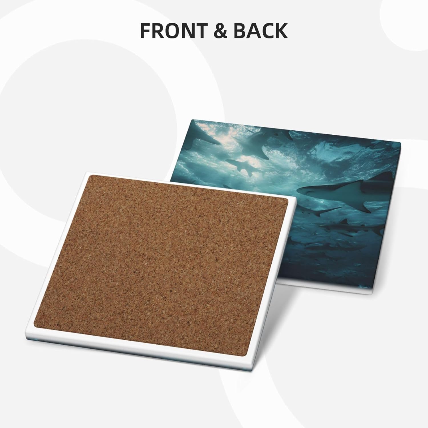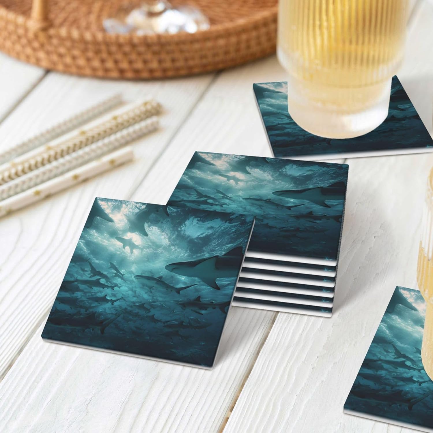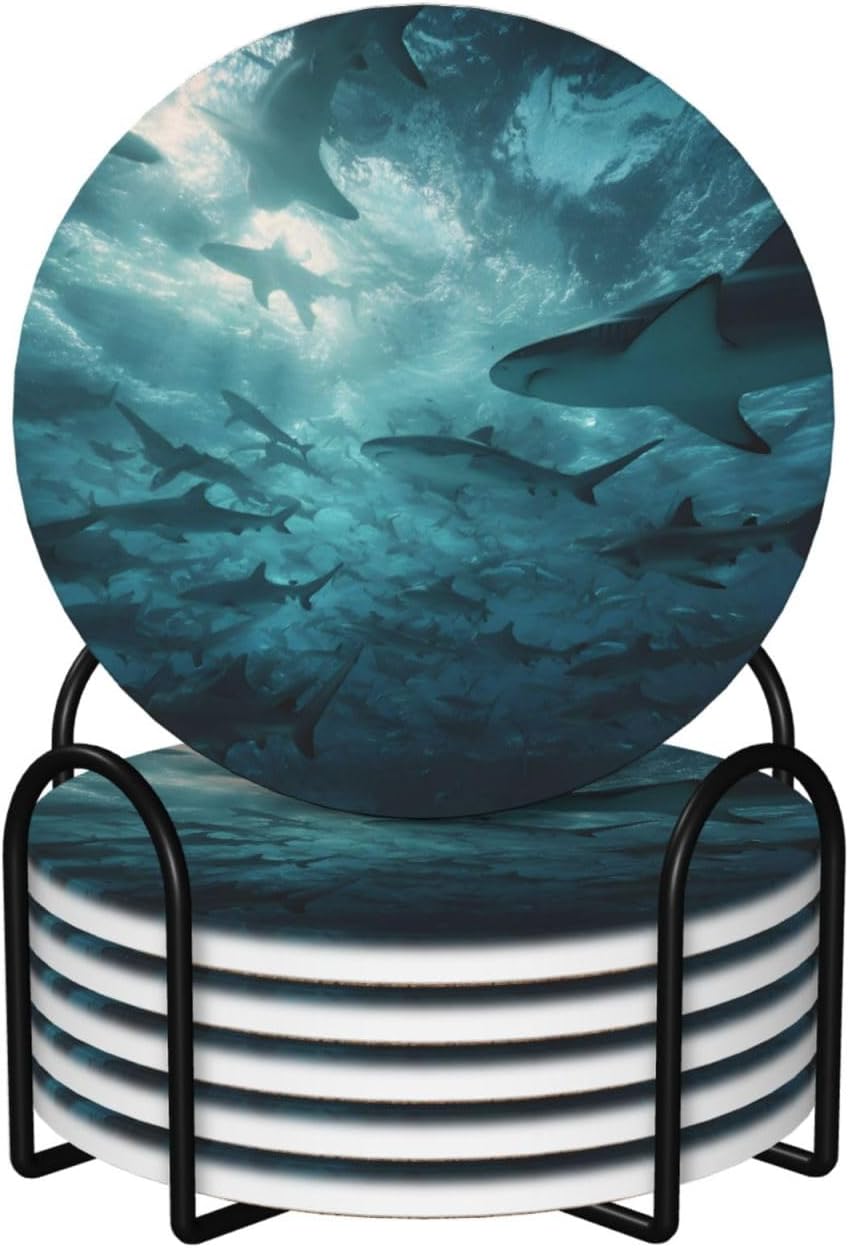Product Name: DCEHGEW Ceramic Drink CoastersMaterial Type: Ceramic with cork bottomSize: Round: 4.1 x 4.1 inches, Square: 3.9 x 3.9 inches, Hexagon: 4.3 x 3.7 inchesPattern: sharks swimming About Our Ceramic Absorbent Coasters:Product Features - Crafted from high-quality ceramic, these coasters are odorless and eco-friendly. Their superior absorbency keeps your surfaces dry by quickly soaking up spills from coffee, cola, and other beverages within 10-15 seconds.Applicable Scenarios - Perfect for adding a stylish touch to your kitchen, living room, bar, hotel, or restaurant. These coasters are an ideal present for birthdays, Mother's Day, Father's Day, Valentine's Day, anniversaries, housewarming celebrations, or Christmas.Accessory Structure - Each set includes 6 ceramic coasters with cork bottoms, accompanied by a sleek black metal stand for organized and aesthetic storage. Choose from three different shapes to suit your style and needs.Washing Instructions - Easily clean these coasters with water or a damp cloth.Special NoteDue to different measurement methods, a deviation of up to 0.3 cm in size is considered normal.Please Note:The product images are for reference only. Actual products may vary slightly due to production factors such as batch differences and machine settings. Minor variations in color, position, and size are normal and not considered defects. Thank you for your understanding!Customer Service:We want to make sure you have an amazing experience with us. Please contact us with any feedback you may have. We love to hear from you and usually respond within 12-24 hours.