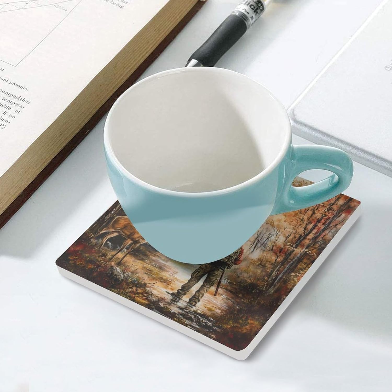 Autumn Deer Hunting U.S.A. Flag Funny Ceramic Coasters for Drinks Absorbent Cup Holder Tabletop Protector with Cork Base