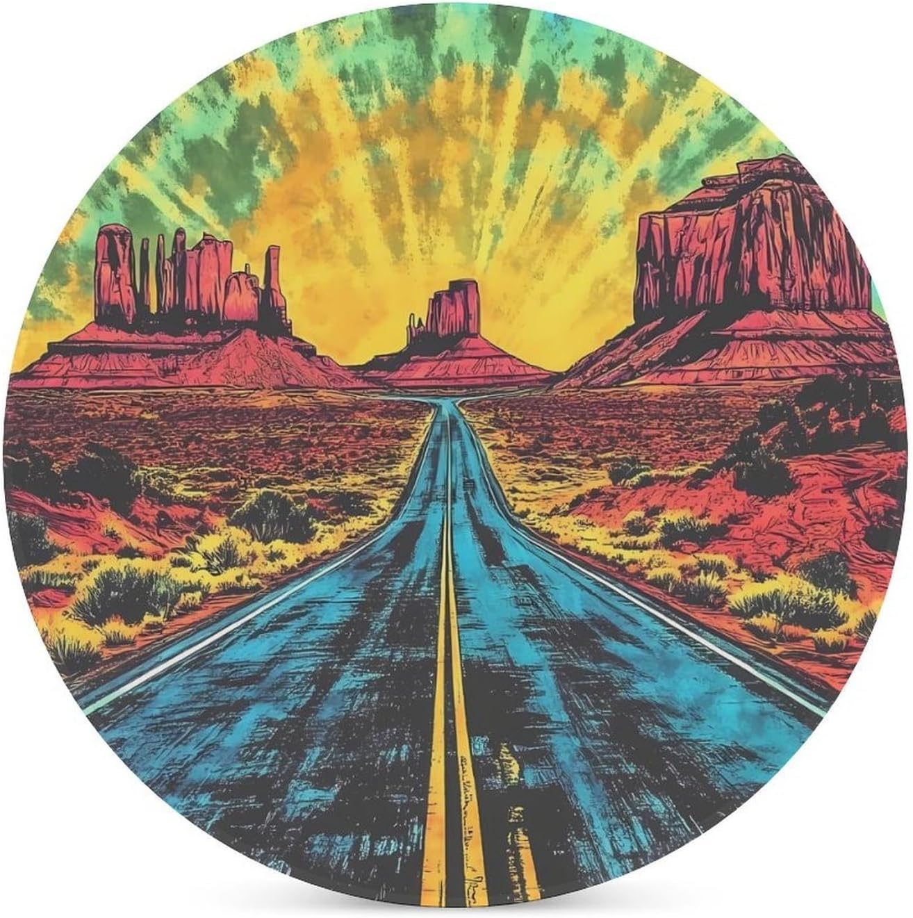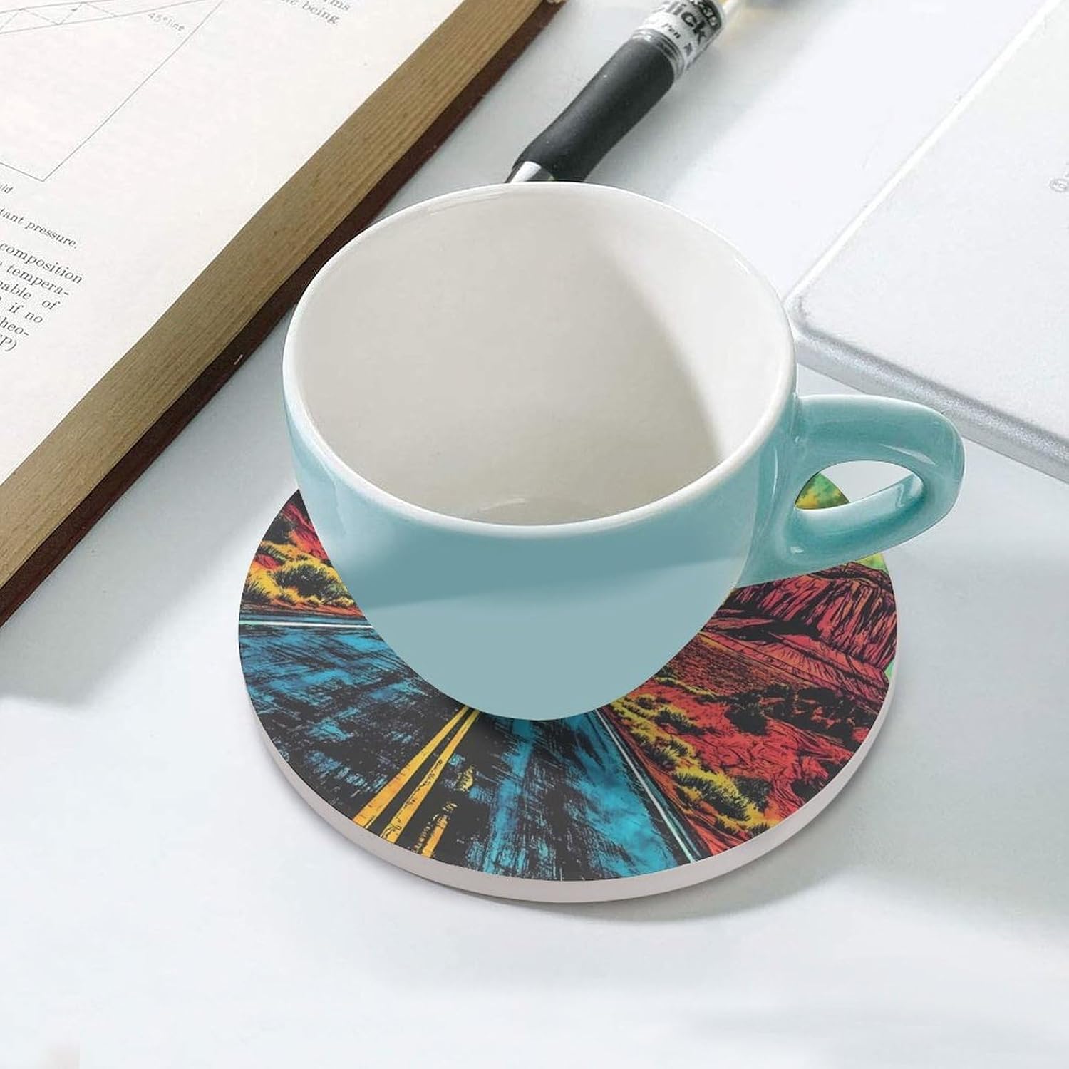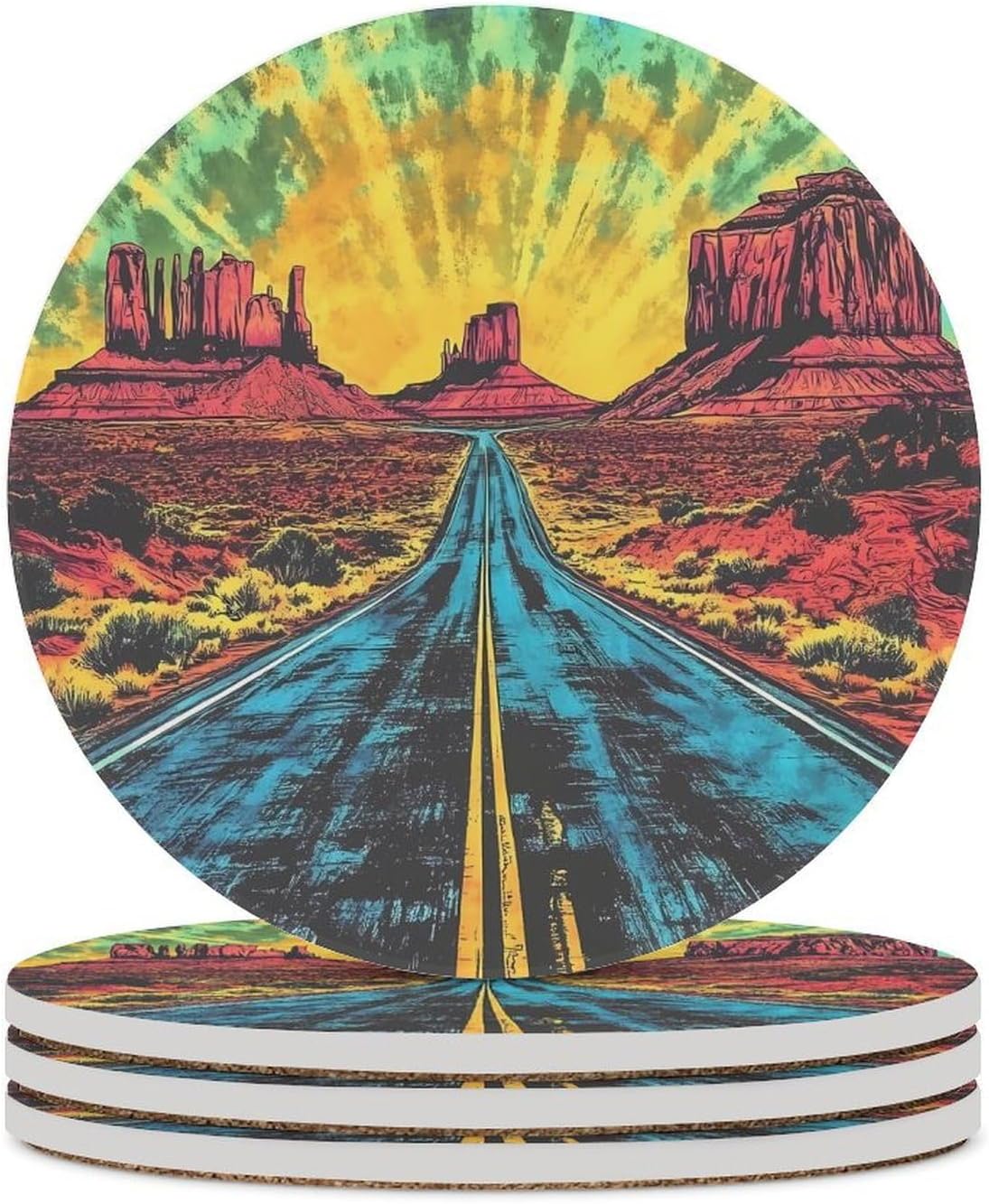 Retro Tiedye Road Desert Round Ceramic Coasters for Drinks Absorbent Cup Holder Tabletop Protector with Cork Base