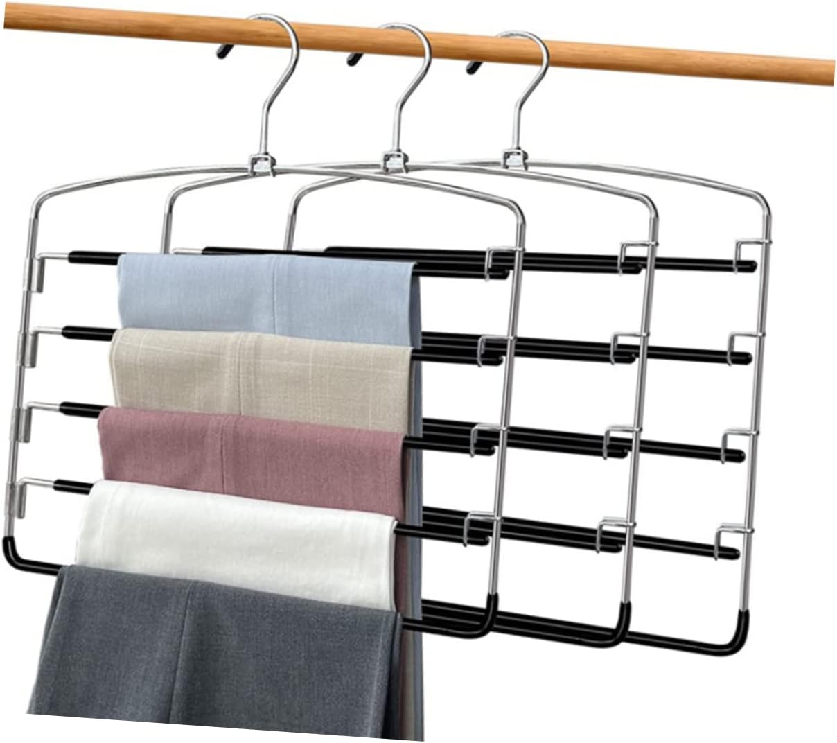 Package List 3 x 5-tier Skirt Hangers Features - Material: High manganese steel space saving pants hangers. - Size: 38.00X33.50X0.50cm/14.93X13.17X0.20inch jeans hangers. - Color: Black pants hanger space saving. - Manufactured with metal material which is and excellent, and strong, for long time use space saving trouser hangers. - Help you maximize your closet space while making it tidy and organized, can be used for home pant hangers space saving. - You can easily save time on dressing as you will be able to find your clothing faster and easier! jeans hangers space saving - Fine workmanship and smooth surface and no burrs, and reliable, without hurting your hands five-layer pants rack. - Easy to use anywhere, such as bathroom, bedroom, wardrobe, and will not easily fall off hangers for trousers.Goods Descriptionsuit hangers Very beautiful and , it is indispensable household pants hanger.clothes hangers›skirt hangers Made of metal material, it's strong, and sturdy for hanging jeans, pants and skirt.multi trouser hanger Simple style, 5-layer design, the skirt hanger is useful and reliable for home use.trousers hangers You can also save time on dressing as you will be able to find your clothes faster and easier!