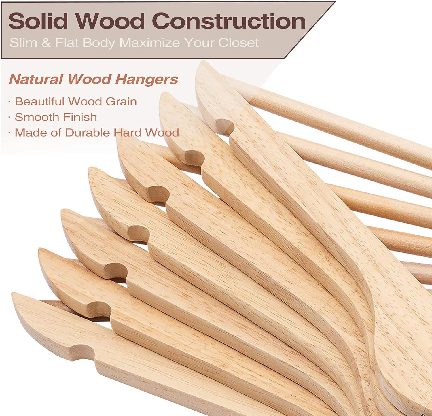 ●Wooden Clothes Hangers: Made by 100% grade A hardwood, delicate polishing by hand and the main body is connected by tenon structure, lightweight yet durable, no burrs on surface. Painting with eco-friendly paint, which will extend the lifespan for wooden suit hangers.●Slim Design: The thickness of our thin wood hanger is only 0.4", thinner and lighter than other basic wood hangers, use less storage space, store more clothes, and easy to carry.●Contoured Shoulder: Ergonomic shoulder with streamlined look, keeps the original shape of clothes and gets rid of winkle, smooth finish will protect your valuable clothes from snagging & pilling.●Precisely-Cut Notches & Horizontal Bar: Well-sanded U notches with splinter-free finish, keep tank tops, vests, camisoles secured in place. The round bar is firmly assembled on the hanger, perfect to hang trousers, towels, socks etc.●360° Rotating Chrome Hook: 360 degree swivel hook with rust-proof chrome plating, convenient for hanging and taking clothes. Heavy duty steel hook fits all standard closet rods, sturdy enough to hold winter overcoat.