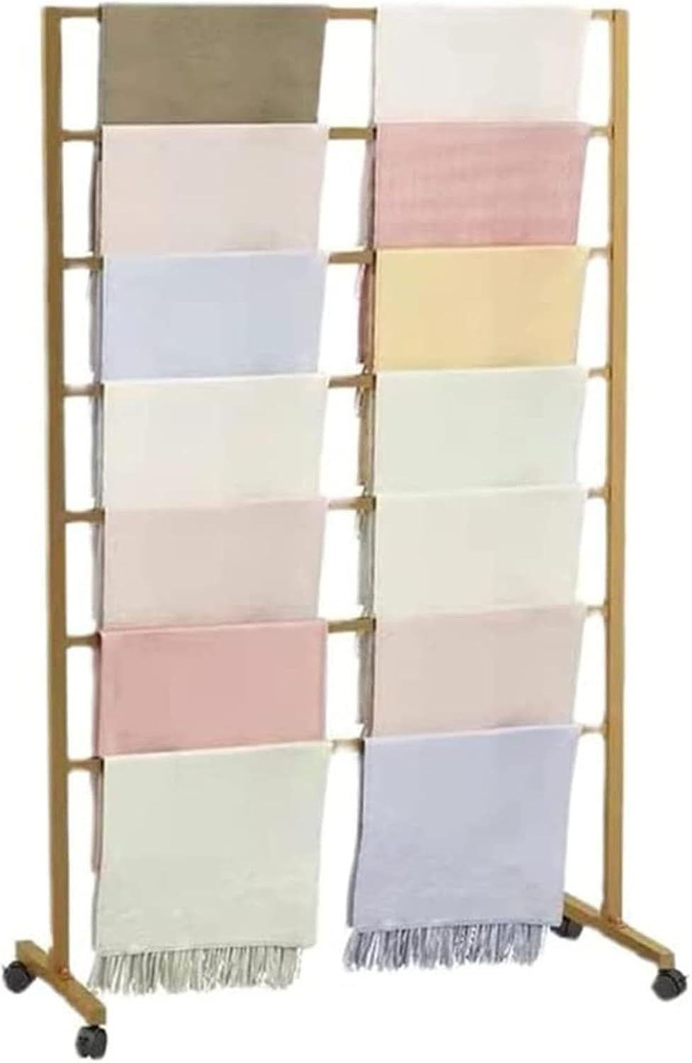 Floor Standing Scarves Rack Features:- Floor-standing multifunctional display stand, which can store a wealth of accessory, such as scarves, belts, pants, socks, etc.- Sturdy structure design, easy to assemble, strong bearing capacity, not easy to deform. Product parameters:Name: Floor Standing Scarves RackMaterial: IronProcess: high temperature baking varnishColor: Gold , White , BlackNumber of floors: 7 floorsLength: 60/80/100/120CMWidth: 40CMHeight: 145CMCrossbar spacing: 15CMWhether to assemble: yesFurniture structure: bracket structureFunction: storage, display, detachable, mobile, storage Products include:1 X Scarf stand
