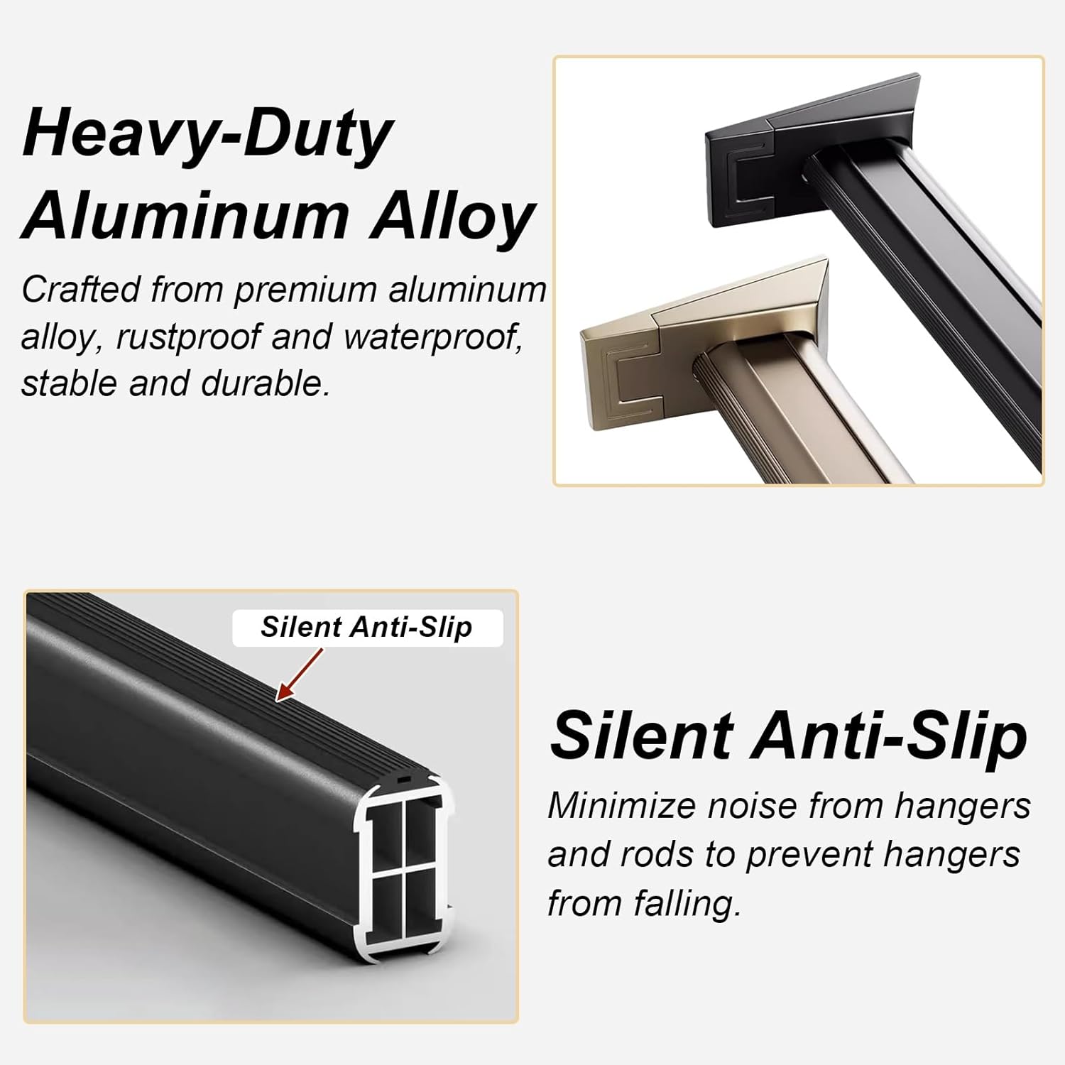 Closet Rod Top Mount Wardrobe Bars:Are you tired of a disorganized closet and flimsy hangers that just can’t hold your clothes in place? Our premium closet rod is designed to enhance your storage experience, ensuring your garments are neatly hung and easily accessible. With a robust design, our hanger rod supports even the heaviest winter coats without sagging or bending, helping you maintain an organized wardrobe effortlessly. Transform your closet into a stylish and functional space with our versatile closet rod, available in three elegant colors: Black, Champagne, and Silver. Measuring between 50-160cm (19 5/8-63in) in length and 2.5mm in thickness, this sturdy rod is perfect for any wardrobe size. Installation is a breeze with the complete set of accessories included – two flanges and four screws – allowing even novice users to set up quickly. Its sleek metallic finish seamlessly blends with your home decor, while the anodized surface provides a refined touch that facilitates smooth sliding for easy garment access. This closet rod isn’t just for clothing; it can also double as a curtain rod, making it a multifunctional addition to your home. Whether you're organizing your wardrobe or enhancing your living space, this product meets diverse needs with style. Please note that measurements may vary slightly due to manual crafting, and actual colors may differ somewhat based on screen variations. Ensure you measure your wardrobe's internal width accurately before making your purchase for the perfect fit. Embrace organization and elegance with our durable closet rod today!