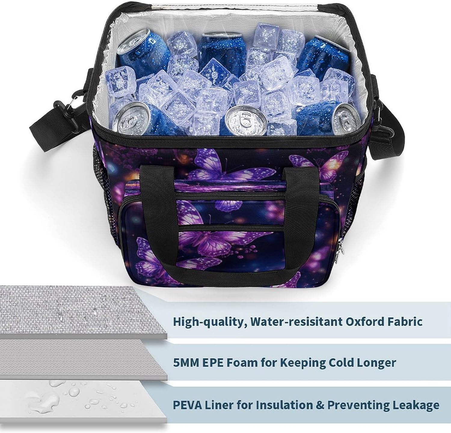 When you're looking for a reliable way to keep your food and drinks fresh while on the move, our Purple Cute Butterfly Print insulated cooler tote is the perfect solution. Made from high-density Oxford cloth with an upgraded aluminum foil lining, it offers superior insulation that maintains the temperature of your items for hours. The leakproof design ensures no messy spills, and the sturdy construction means it can handle the rigors of daily use, whether you're commuting to work or heading out for a weekend camping trip.The 22.5L large capacity provides ample space for all your essentials, from sandwiches and salads to cans of soda and bottles of water. The comfortable 66cm straps make it easy to carry, and the compact vertical design doesn't take up unnecessary space in your car or backpack. Whether you're packing a meal for the office, preparing for a family picnic, or stocking up on groceries, this cooler bag has you covered.Forget about flimsy coolers that fall apart after a few uses or fail to keep your food fresh. Our reusable cooler tote combines practicality, durability and style in one package. Its neutral design works for everyone, and its versatility makes it a must-have accessory for anyone with an active lifestyle. Invest in a cooler bag that meets all your needs and simplifies your on-the-go eating experience. Lightweight Cooler Bags Oxford Cloth Cooler Bags Ice Packs Reinforced Handle Ice Chest Cooler Bag Tote Cooler Bag Versatile Cooler Bags Portable Insulated Cooling Everyday Cooler