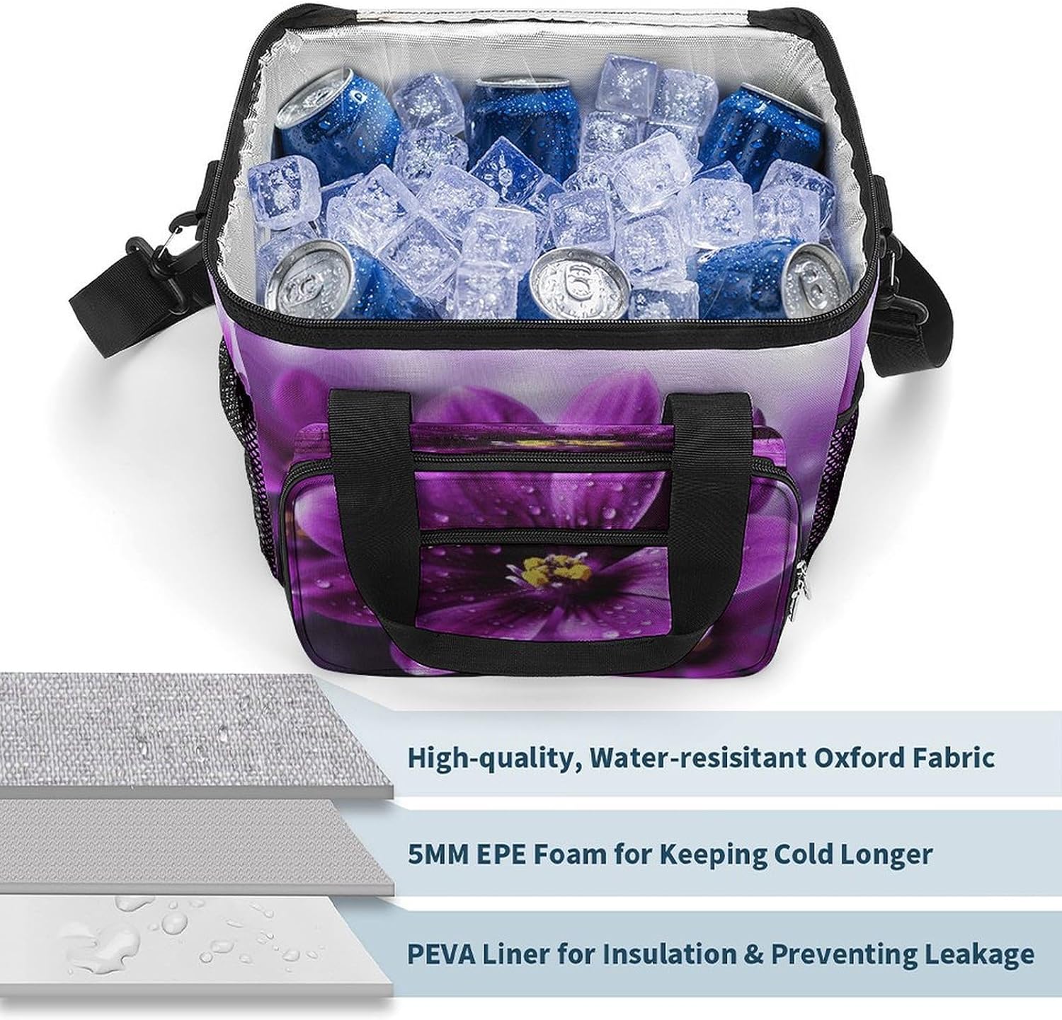 When you're looking for a reliable way to keep your food and drinks fresh while on the move, our Purple Flower insulated cooler tote is the perfect solution. Made from high-density Oxford cloth with an upgraded aluminum foil lining, it offers superior insulation that maintains the temperature of your items for hours. The leakproof design ensures no messy spills, and the sturdy construction means it can handle the rigors of daily use, whether you're commuting to work or heading out for a weekend camping trip.The 22.5L large capacity provides ample space for all your essentials, from sandwiches and salads to cans of soda and bottles of water. The comfortable 66cm straps make it easy to carry, and the compact vertical design doesn't take up unnecessary space in your car or backpack. Whether you're packing a meal for the office, preparing for a family picnic, or stocking up on groceries, this cooler bag has you covered.Forget about flimsy coolers that fall apart after a few uses or fail to keep your food fresh. Our reusable cooler tote combines practicality, durability and style in one package. Its neutral design works for everyone, and its versatility makes it a must-have accessory for anyone with an active lifestyle. Invest in a cooler bag that meets all your needs and simplifies your on-the-go eating experience. Lightweight Cooler Bags Oxford Cloth Cooler Bags Ice Packs Reinforced Handle Ice Chest Cooler Bag Tote Cooler Bag Versatile Cooler Bags Portable Insulated Cooling Everyday Cooler